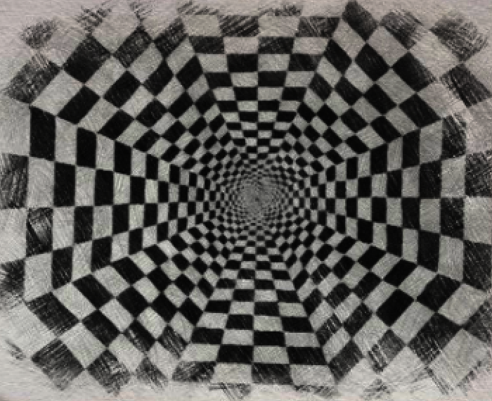 I drew this "tunnel" using strict mathematic structure. An eight sided figure with each side divided by four. Perfect symmetry. If you stare into the center your eyes play tricks on you.