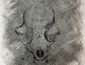 I found a skull on the beach and cleaned it out. My favorite way to make art is to draw something I can actually look at. I sat this skull onto my desk and drew it. Then I added a layer of grey transparent cross stitching.