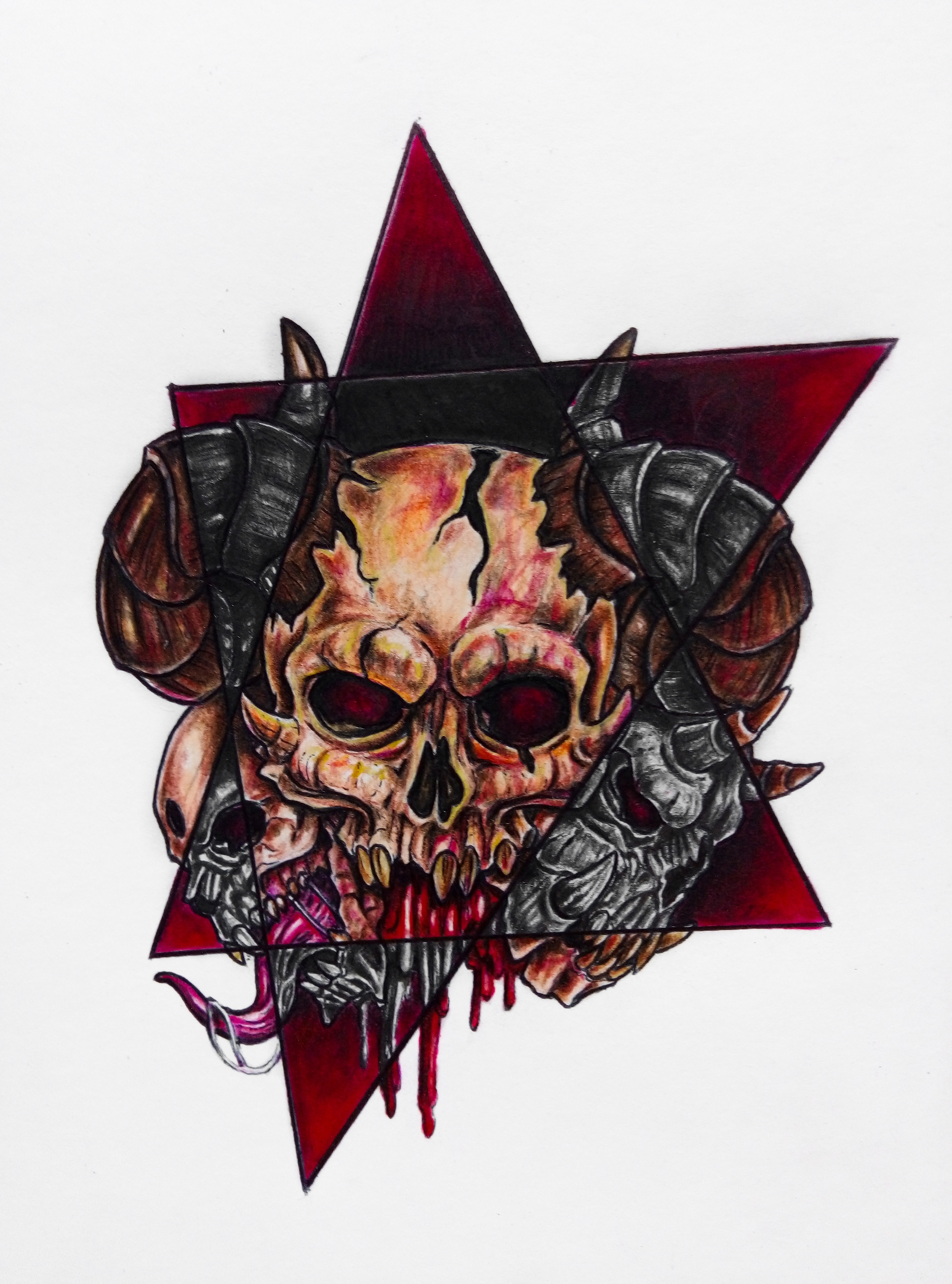Demensiones:3120x4208 Design of three skulls made with mixed technique. The color areas have a watercolor base and then were detailed with colors, the gray areas were detailed with 6b and 8b pencils, and retouched with black.