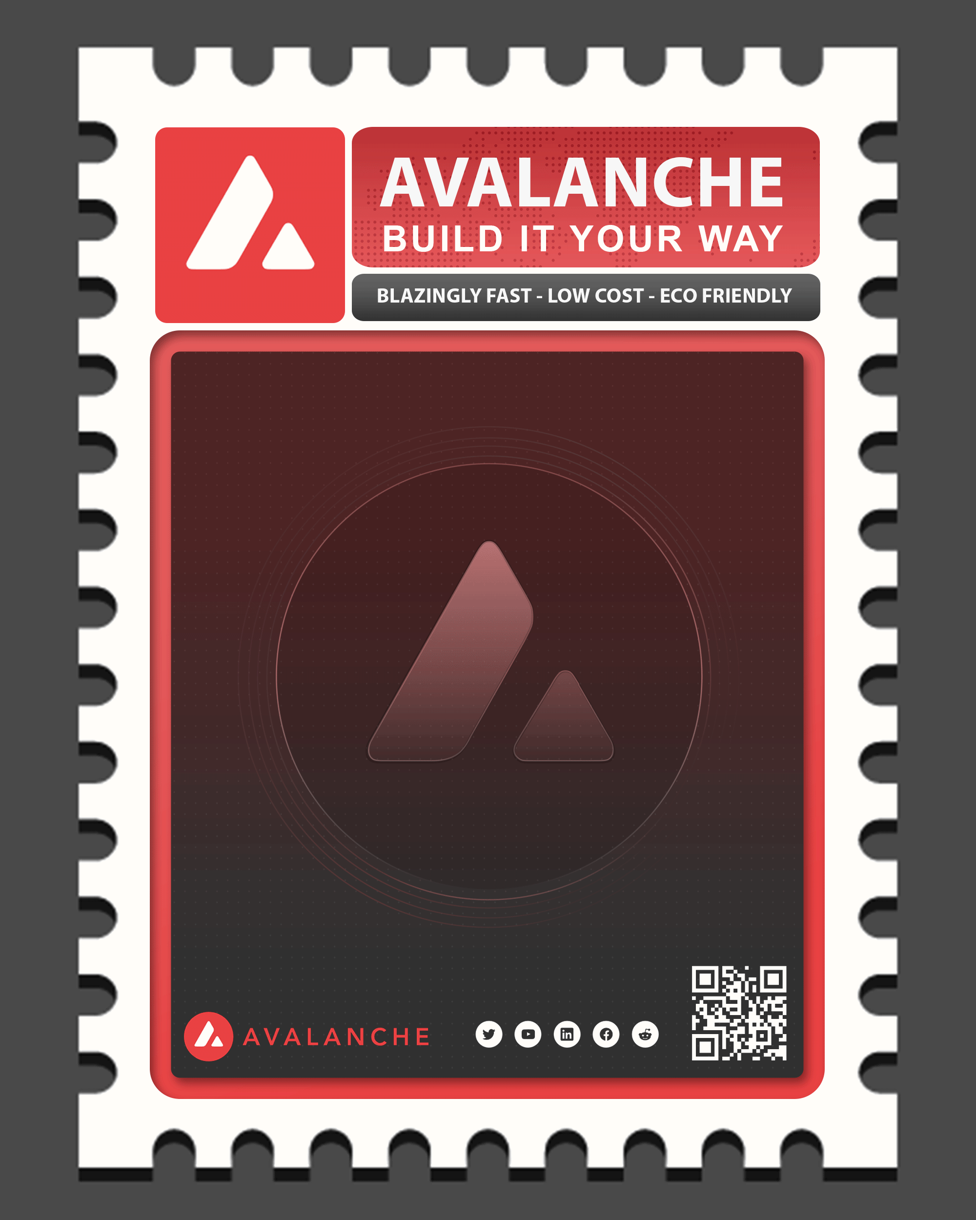 Original Crypto Stamp of Avalanche layer one blockchain that functions as a platform for decentralized applications and custom blockchain networks. It is one of Ethereum’s rivals, aiming to unseat Ethereum as the most popular blockchain for smart contracts. Higher transaction output of up to 6,500 transactions per second while not compromising scalability.