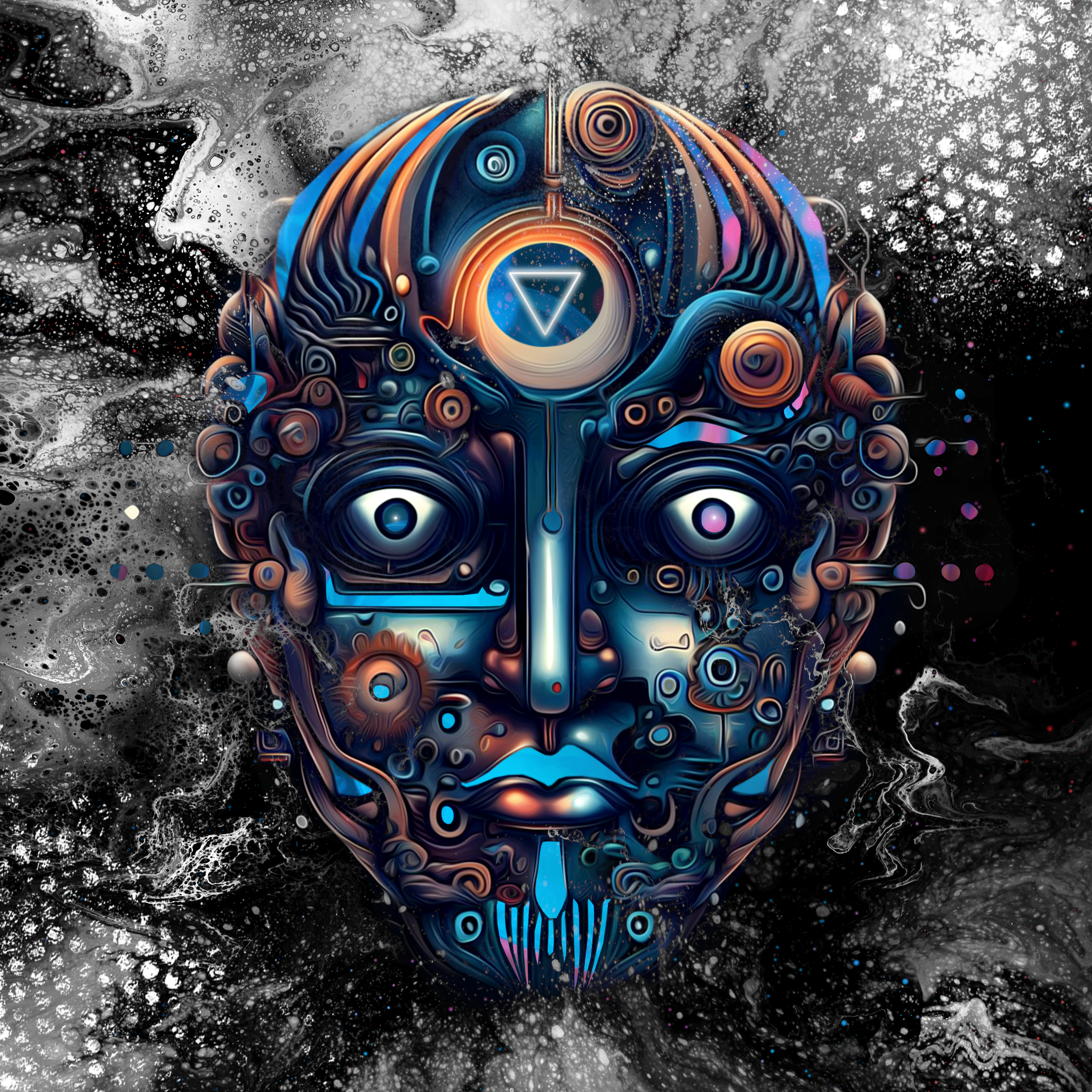 The inverted triangle aligned in the center of the forehead evokes a sense of mystery and symbolizes a convergence of opposing ideas and concepts.