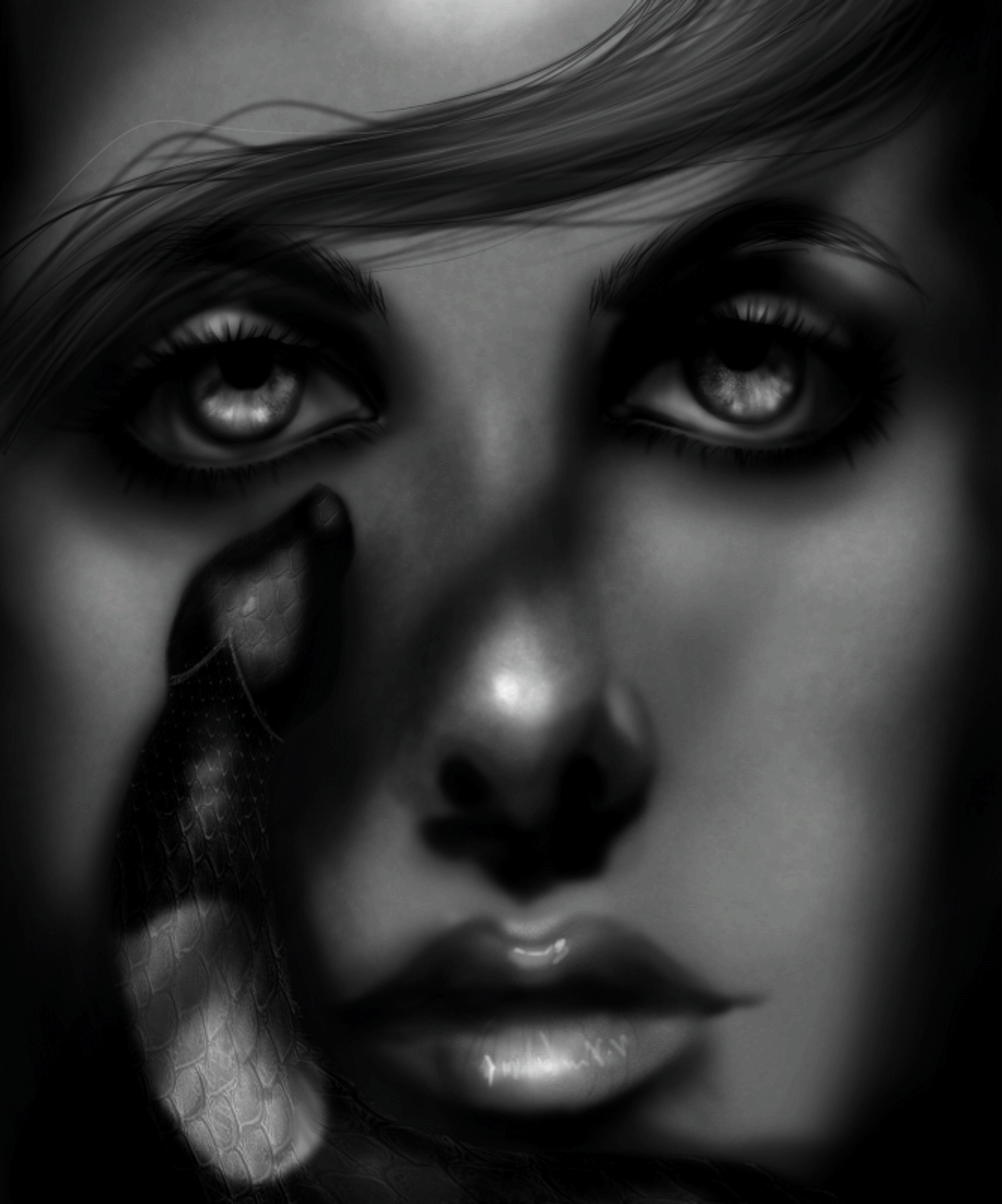 A cold and calculating woman, without feelings, she is the queen of snakes, a portrait that expresses coldness in her eyes and an interesting black and white tone.
