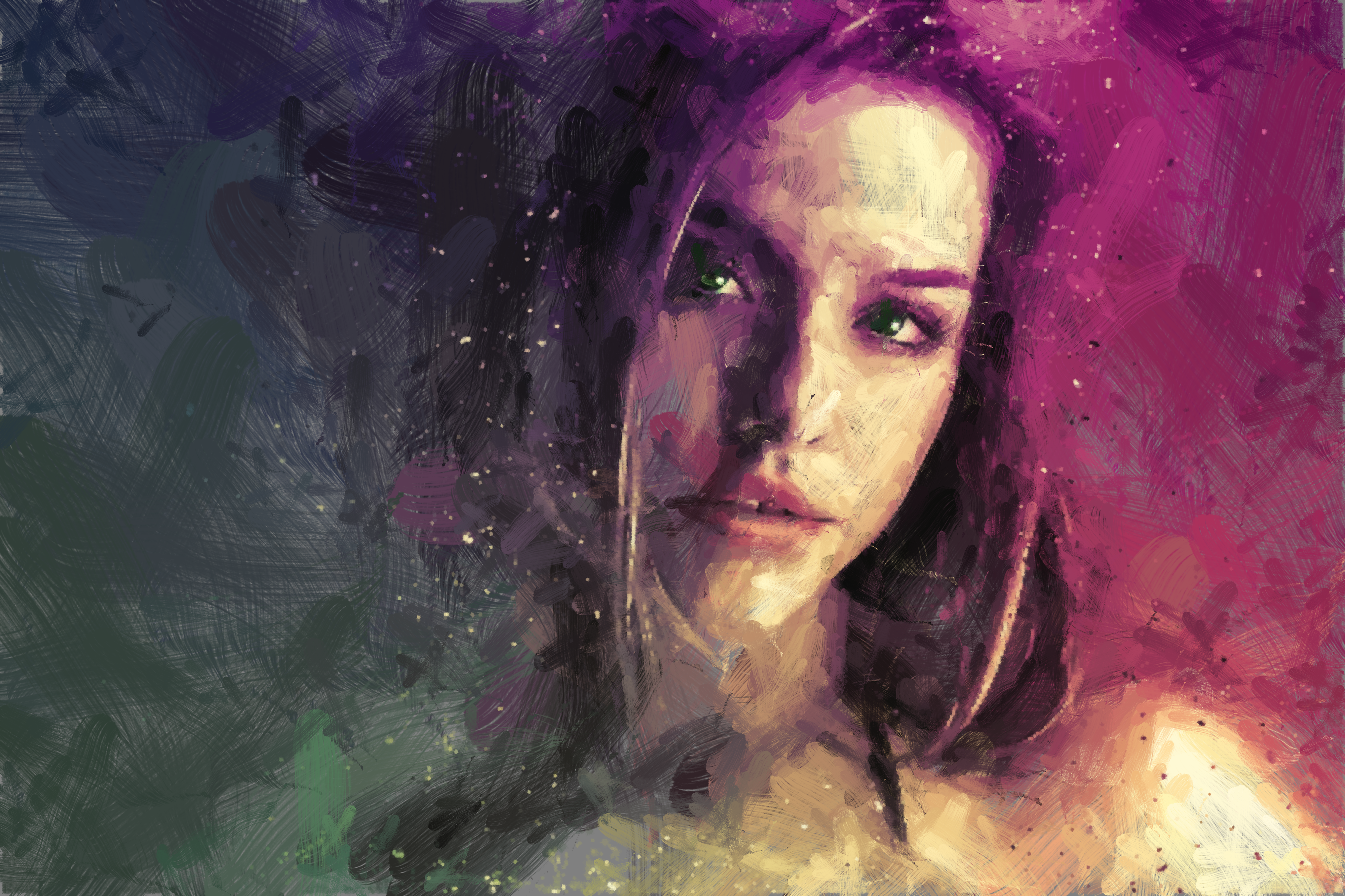 A girl asking you "Do you wanna dance" at the disco. Background lights in dark green and fuchsia, and a beautiful girl. A magistral job painted with Procreate. Only one edition.