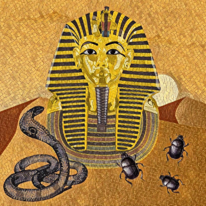 This digital art is to remember Tutankhamon, the Egyptian pharaoh on all his magnificence. Created with the image of Tutankhamon, pyramids on the background, a cobra, and some beetles. A special edition to be proud of.
