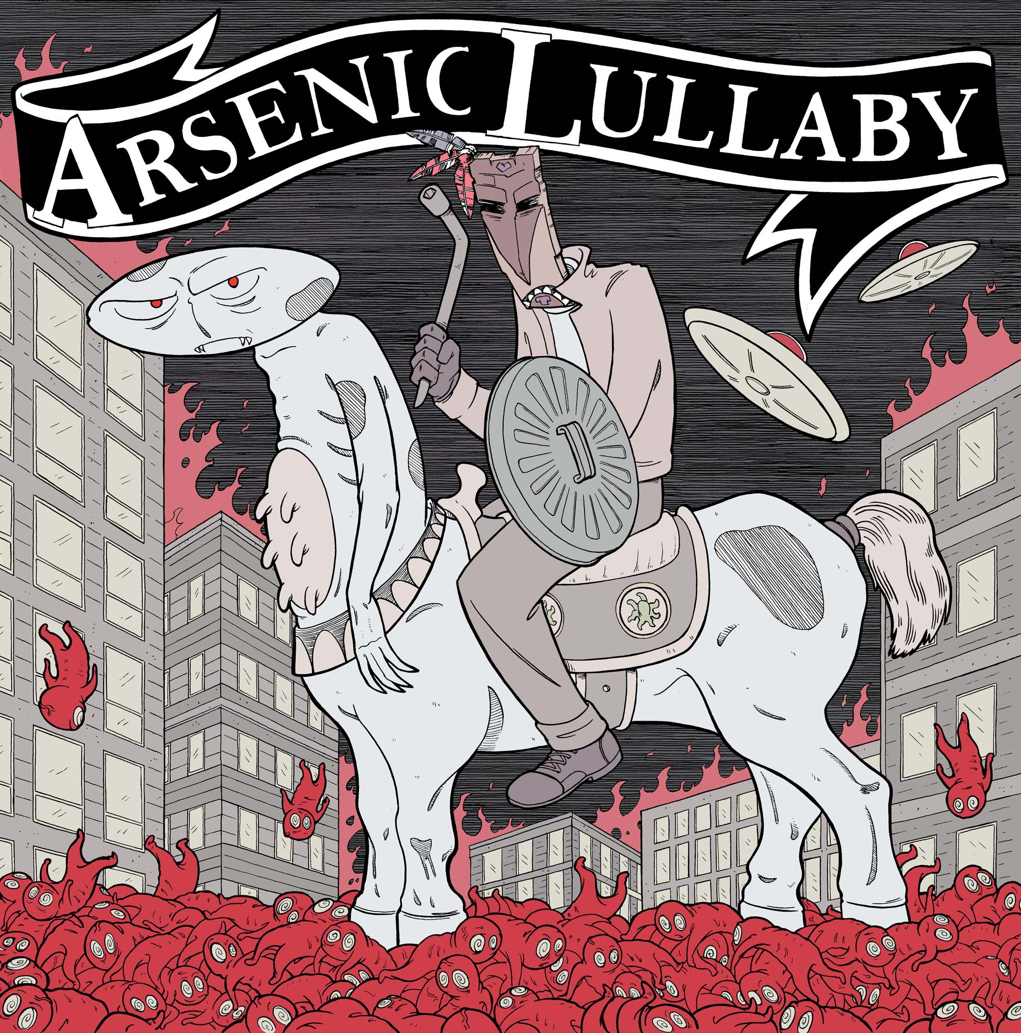 This features fan favorites from the Arsenic Lullaby comic book series, Voodoo Joe, the zombie fetuses and Alien Centaur all in one piece. Composition is a homage to the iconic Molley Hatchet album cover by Frank Frazetta "death dealer".