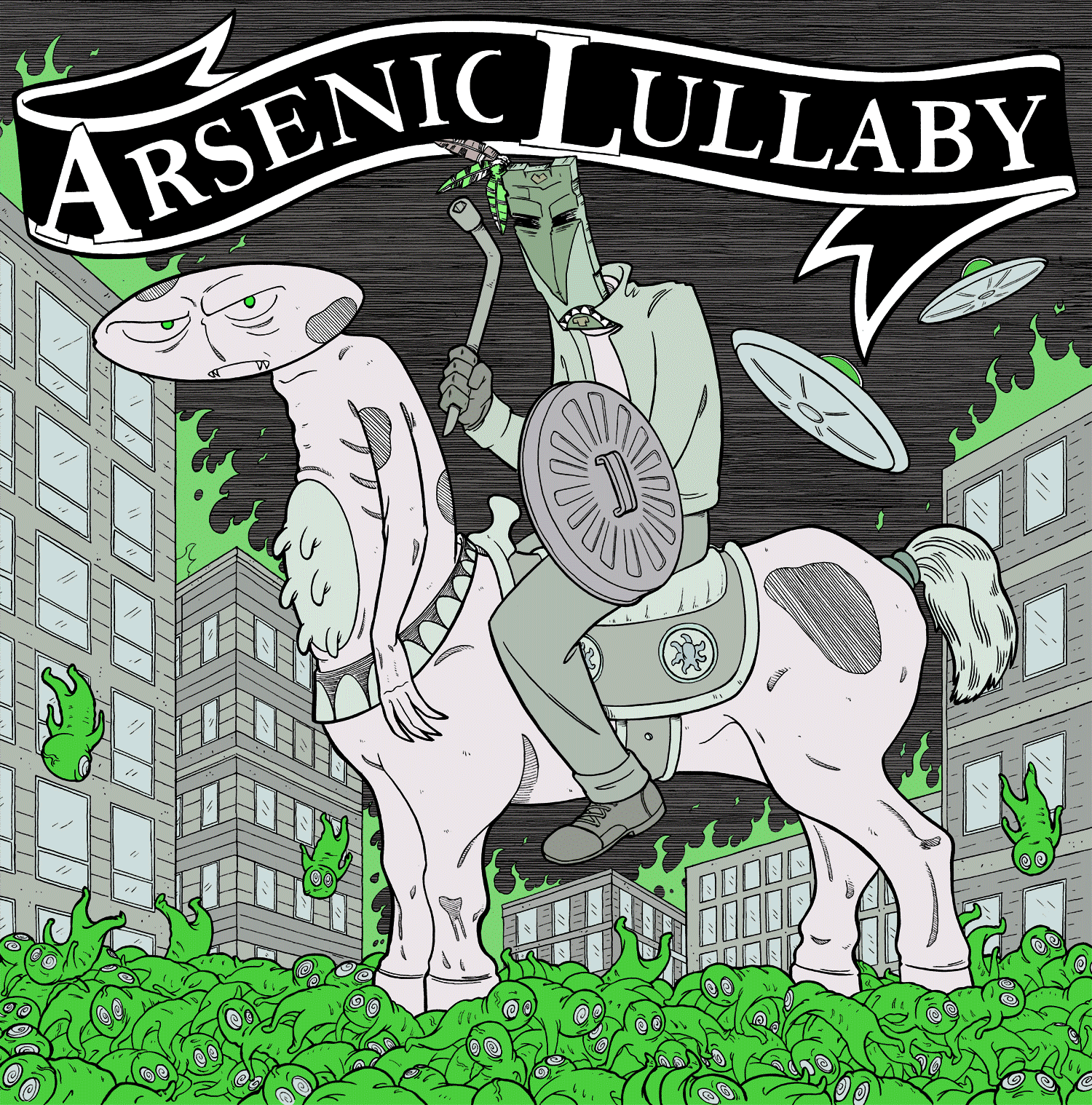 This features fan favorites from the Arsenic Lullaby comic book series, Voodoo Joe, the zombie fetuses and Alien Centaur all in one piece. Composition is a homage to the iconic Molley Hatchet album cover by Frank Frazetta "death dealer". Painstakingly illustrated via traditional tools ( pencil, brush, ink) to get the old school comic look and colored digitally, by Arsenic Lullaby's own Eisner award nominated Douglas Paszkiewicz! (that'd be me). Douglas has done work for Mad Magazine, The Tick, Comedy Central and many others. Originally drawn at 14x14 inches, this piece is 300 dpi and 2000x2024 You can find more info about Arsenic Lullaby at http://arseniclullabies.com/