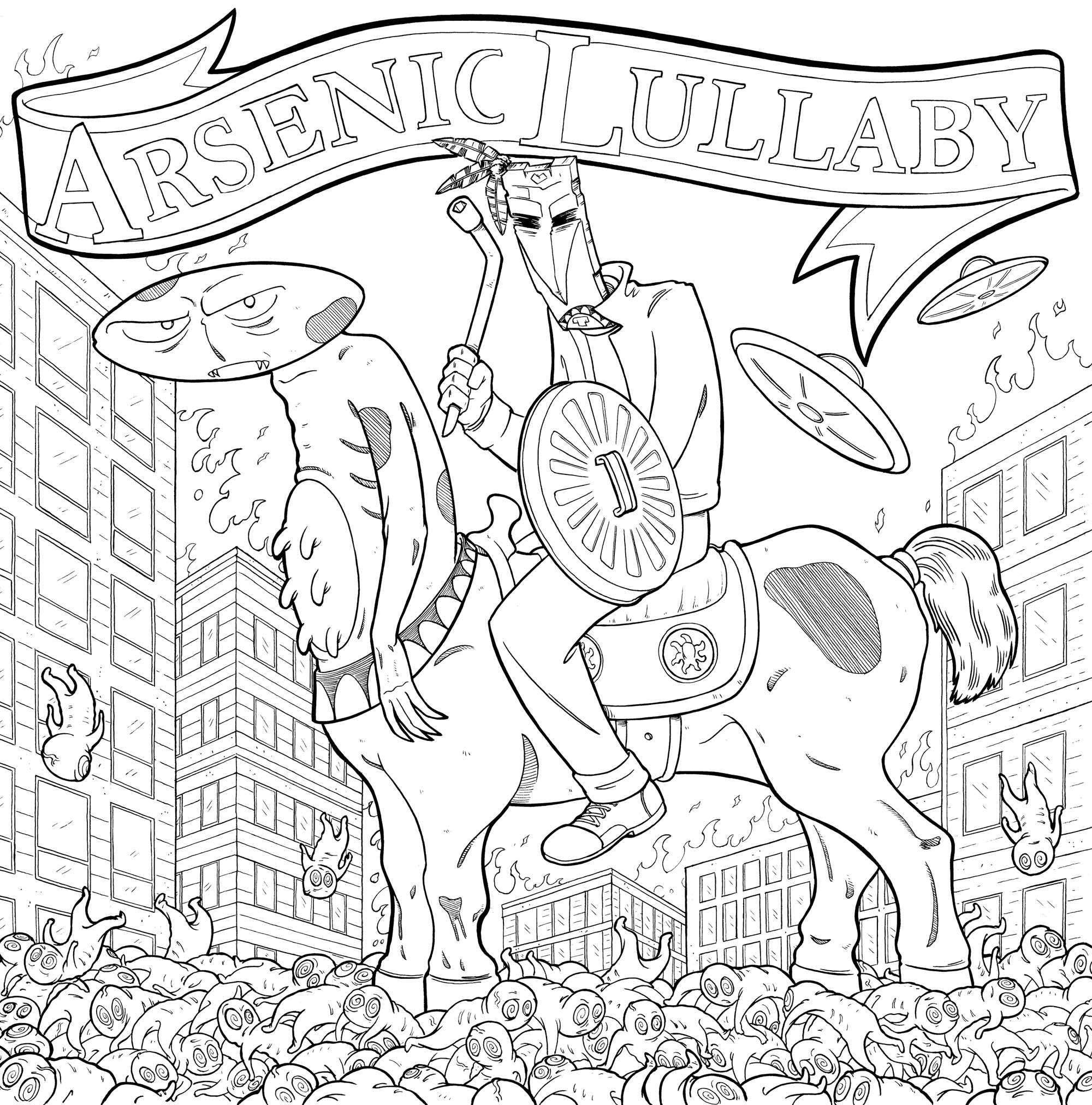 Minted for the NFT Showroom 1 year anniversary! This is the bare black and white inks of the digitally colored version. Every last curve, stroke, and dot that were all done by hand with ink and a brush are here obscured. I rarely mint the core black and whites of any illustration and this is a one of one. This features fan favorites from the Arsenic Lullaby comic book series, Voodoo Joe, the zombie fetuses and Alien Centaur all in one piece. Composition is a homage to the iconic Molley Hatchet album cover by Frank Frazetta "death dealer". Painstakingly illustrated via traditional tools ( pencil, brush, ink) to get the old school comic look and colored digitally, by Arsenic Lullaby's own Eisner award nominated Douglas Paszkiewicz! (that'd be me). Douglas has done work for Mad Magazine, The Tick, Comedy Central and many others. Originally drawn at 14x14 inches, this piece is 300 dpi and 2000x2024 You can find more info about Arsenic Lullaby at http://arseniclullabies.com/