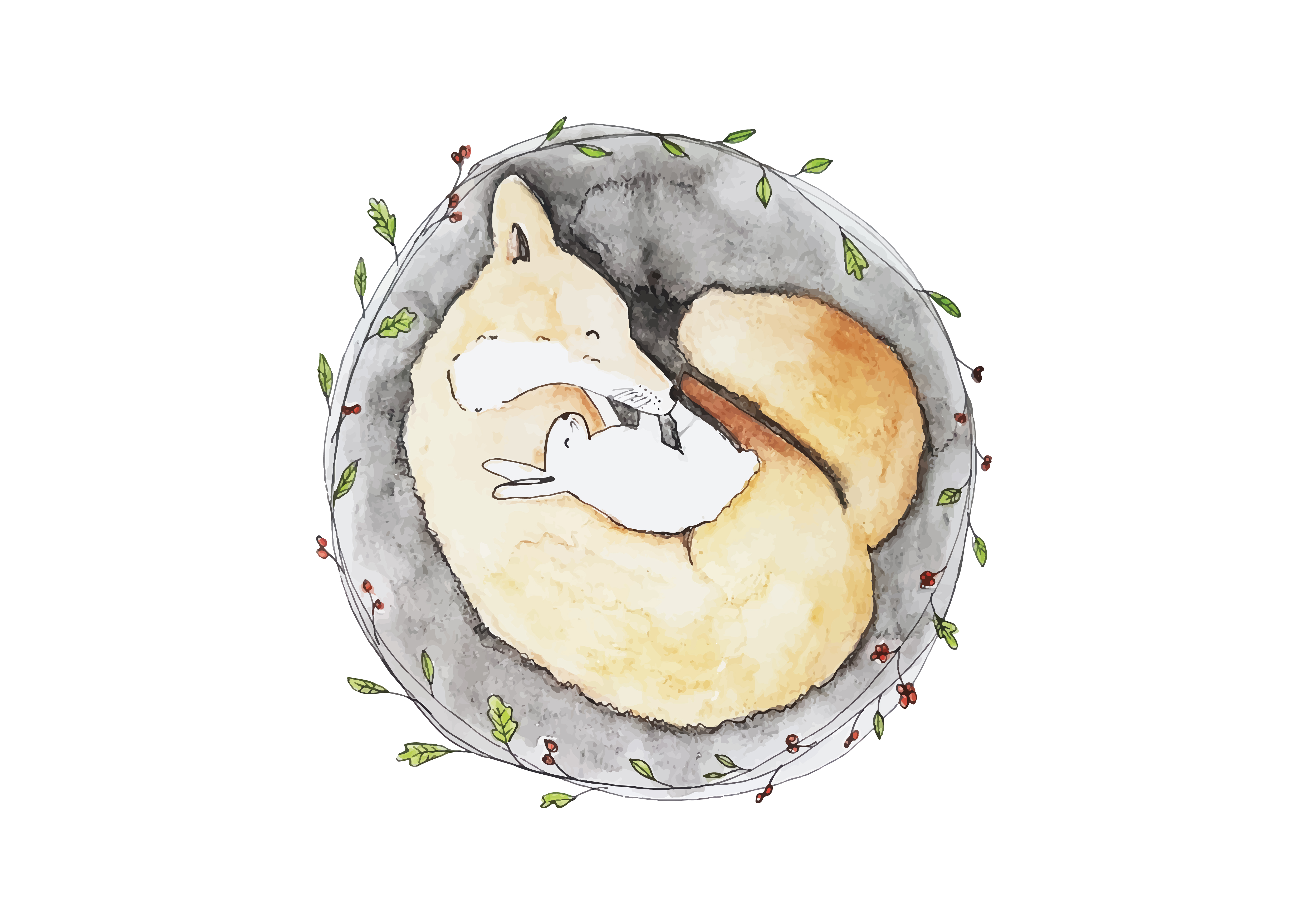 Minimal watercolor artwork of a different forest life where fox and rabbit are best friends. Original size - 4961x3508px, 300dpi