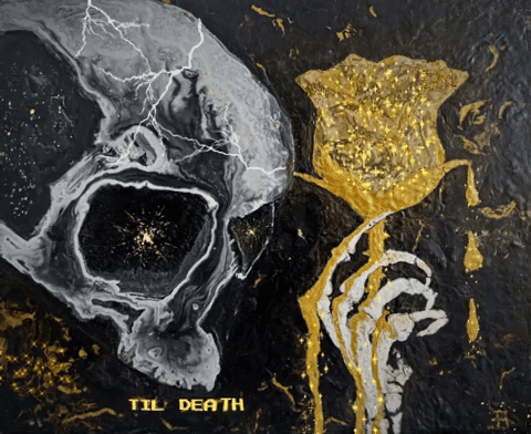 The Gloden Flower, Till death the curse of love. This art is made with acrylic paints with pouring technique and POP to give a sculptured look on a canvas and edited with gifs. Just 5 gifs are made to be owned, limited edition.