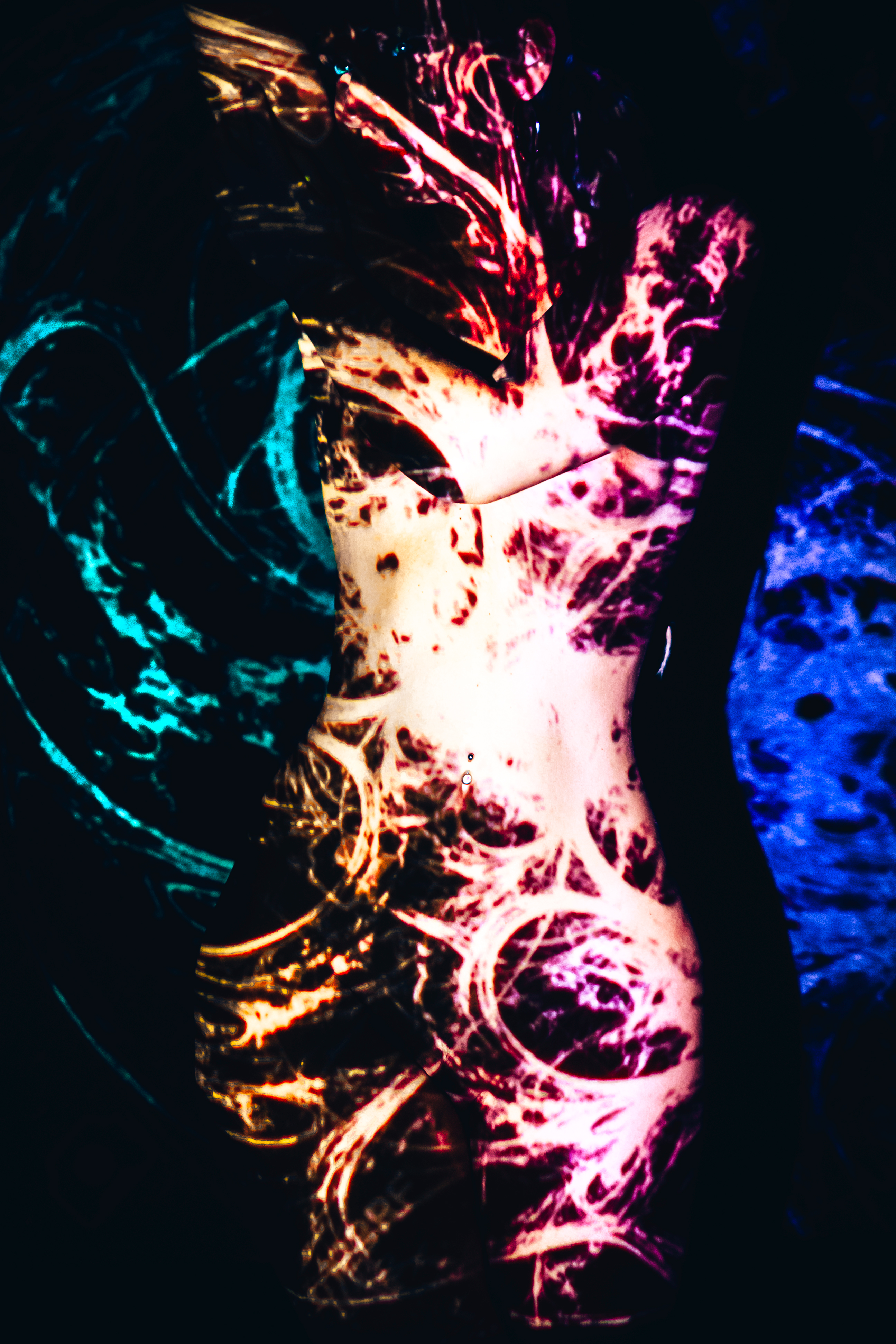 Studio art portrait Actually this is nude portrait using the light of projector with some abstract colorful drawing Result is quite unpredictable and quite a fun to play with combination of those forms