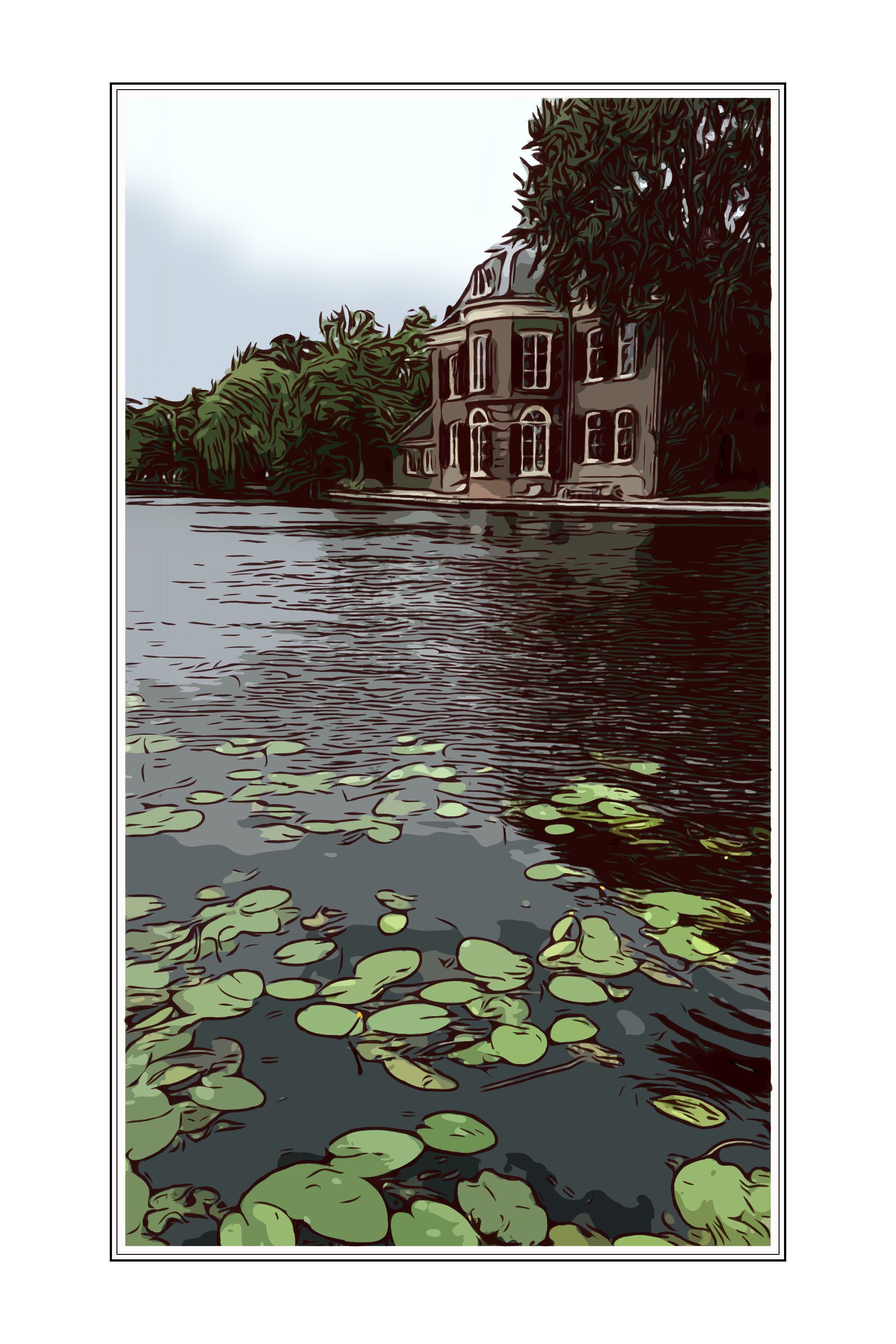 Image from the book with the dutch title: Leidsche Ommelanden (Surroundings of Leiden). The picture shows the historic country house "Rhijnhof" or "Dubbelhof" on the Old Rhine River near the city of Leiden.