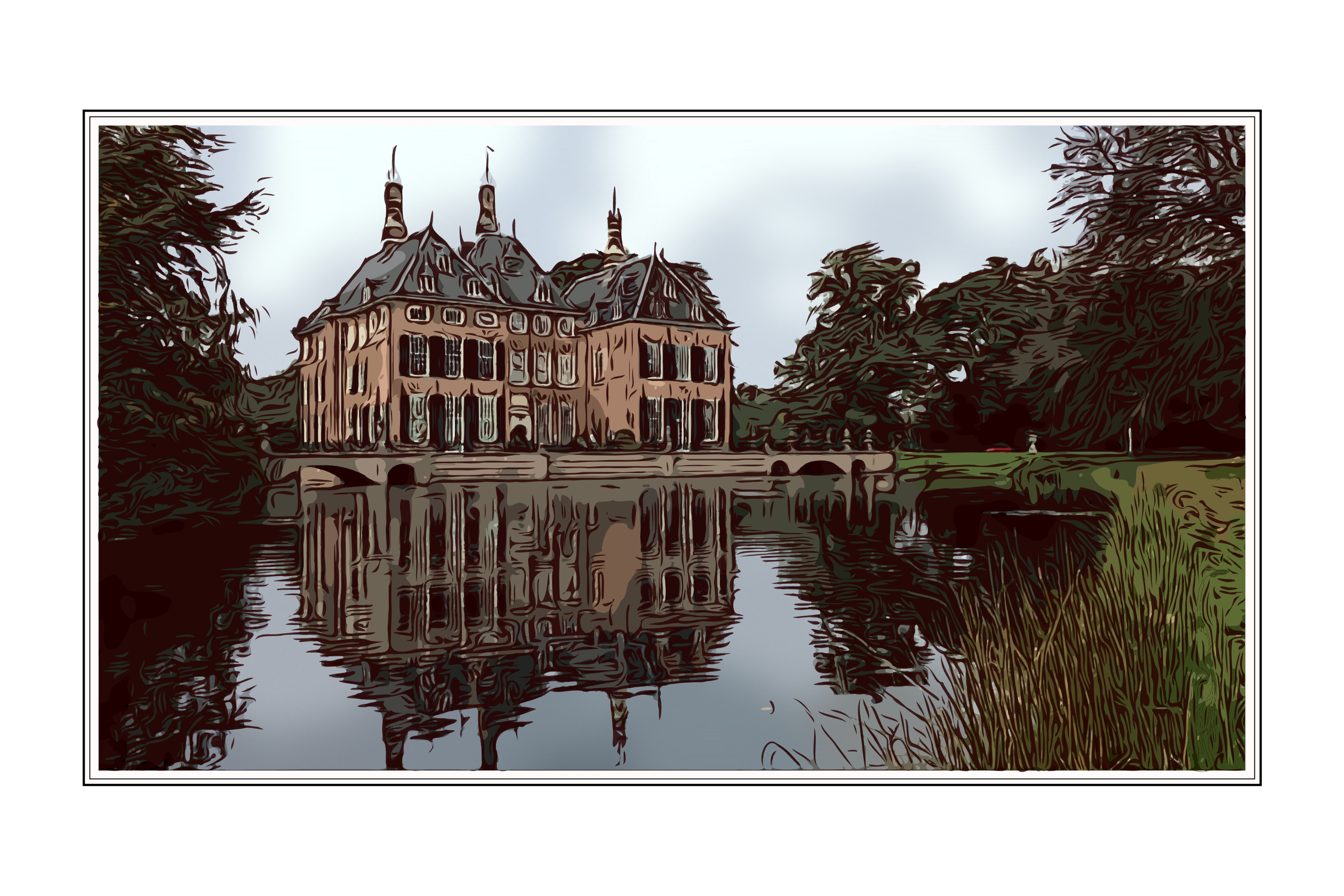 Image from the book with the dutch title: Leidsche Ommelanden (Surroundings of Leiden). The picture shows the castle Duivenvoorde in Voorschoten near the city of Leiden, which has a history dating back to the Middle Ages. This picture is part of a series. Inspiration for this series are the books about The Netherlands, issued first half of the 20th century by the dutch biscuit manufacturer Verkade. The books were illustrated with collectable watercolor art pictures, which were reproduced with chromolithography. The art pictures were collected by children and later also by adults and had a very recognizable style. Digital chromolithography: In my works I have been inspired by the typical colors of chromolithography and classical composition of these books. The works themselves are created as fully digital vector images. About this publication: This work has been published in a series of 5 pieces in the dimensions of 2000 by 3000 pixels. Additional publications of this work in distinctively different sizes are reserved.