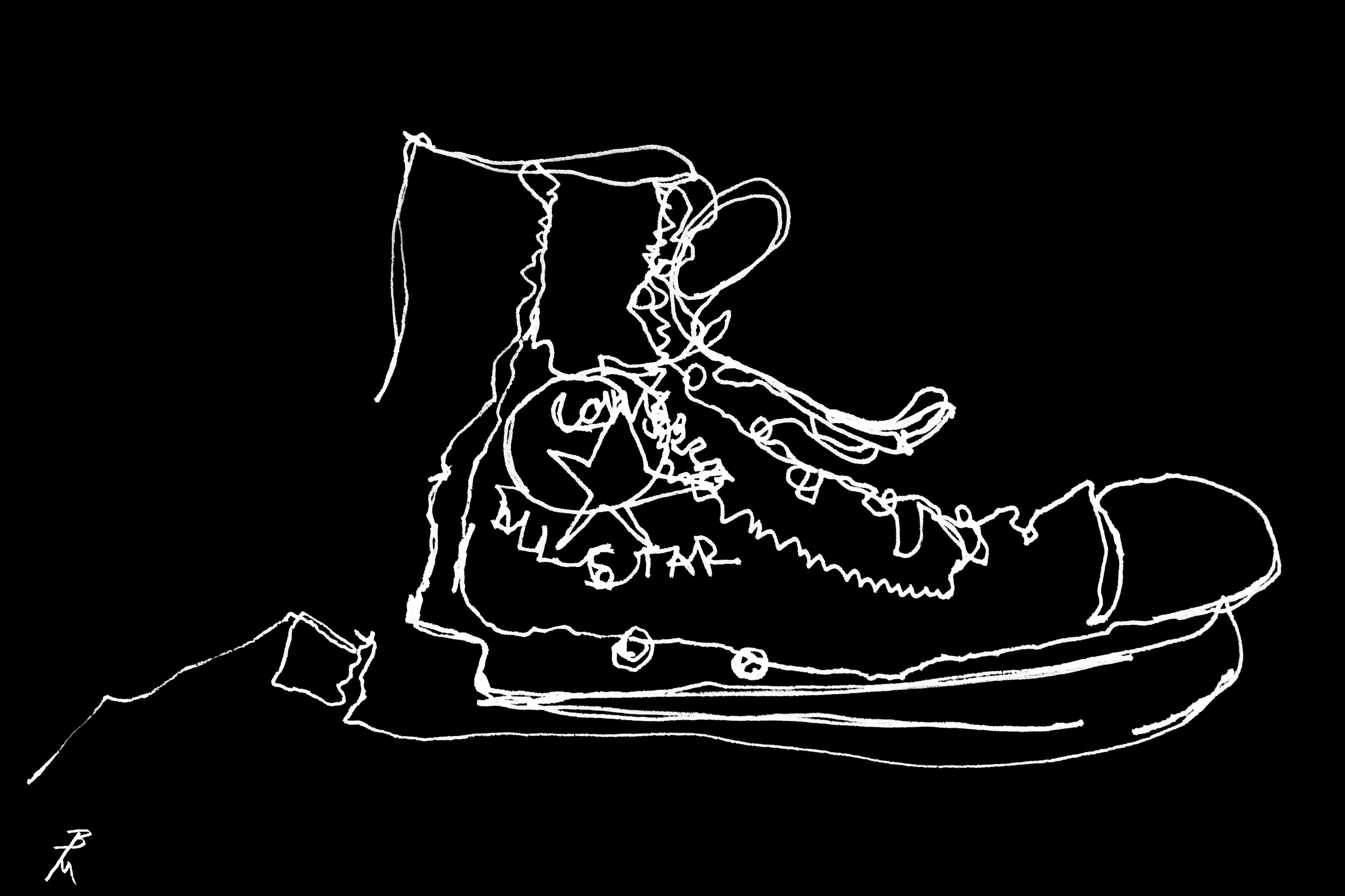 This Blind Contour Drawing was inspired by a pair of “Chucks”, as we called them roughly 30 years ago. I saw them on this guy while I was waiting in line at the convenience store. What can I say, I was craving a hot cup of coffee and was feeling bored while waiting. The line was moving slower than normal. I believe someone's apple pay wasn’t working quite right. Anyhow, I look down at the guys feet in front of me (I don’t usually check out peoples footwear) and I was taken back in time. I was transported (mentally..hehe) back to about 1989/90, when I acquired my first set of Chucks.. Converse All Stars. What an awesome pair of shoes. Somewhere along the way I threw them out. The holes in the canvas just got too big, otherwise I would have loved to still have them.