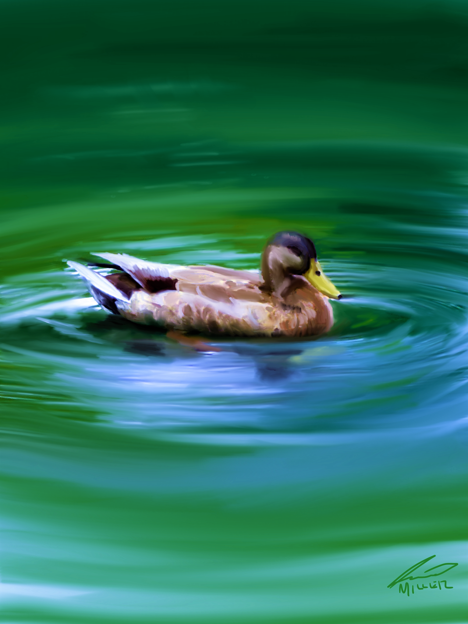 I created this approximately two years ago and did so after taking a walk down to the lake behind our home. I observed a female mallard fast asleep on the water on a very calm day. The ripples around her body and her shut eyes, along with the tranquility of the day, put me at ease and combed my spirit. I wanted to duplicate this image in my mind digitally. I tried to capture the easy gentle feeling and the calmness of a female Mallard duck, floating on top of a Stillwater surface. I tried to capture some of the colors that I had observed that day. The water was more or less a green color with tinges of blue and purple. You could see a slight reflection and the bright orange color of her webbed feat as they balanced her body under the surface.