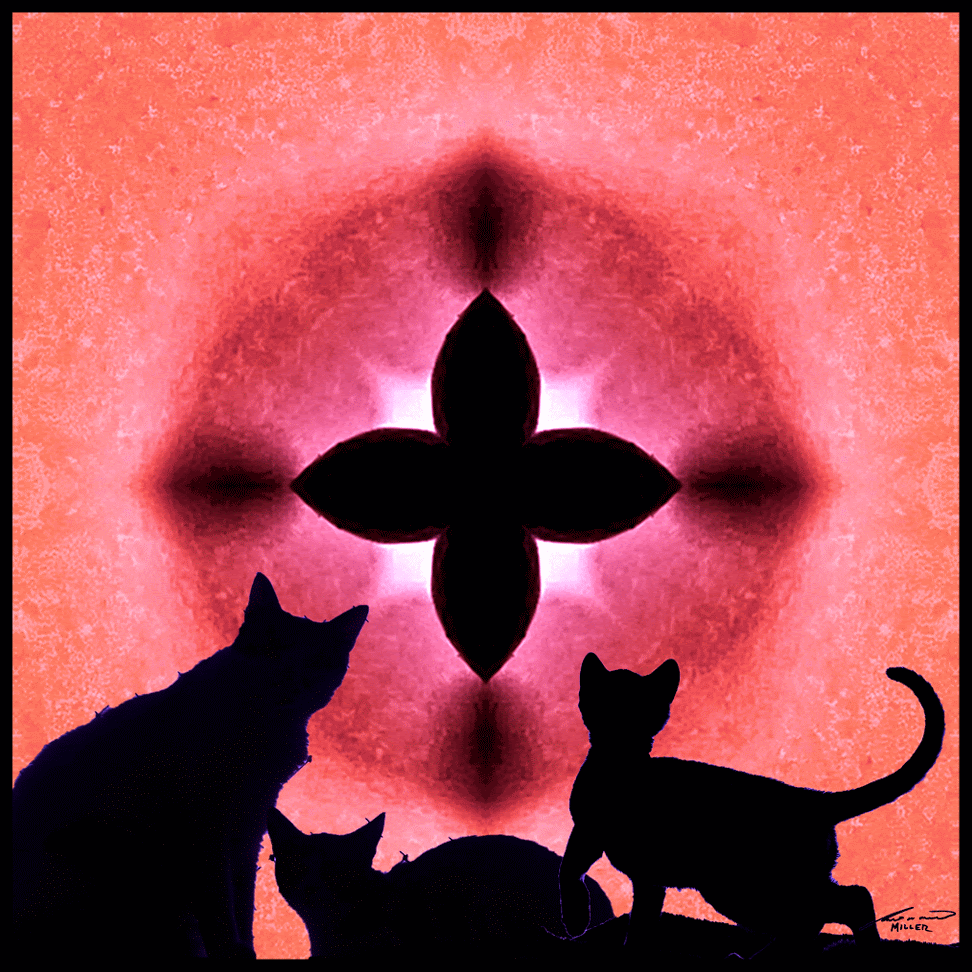 This GIF image was created using food, time, creativity and of course cats. Yes, I said food. That thingy spinning in the center, the thing the cats are aware of and curious about.. That was originally a photograph of an M&M I took for a drawing. Now, some time later it is the focus of feline curiosity.