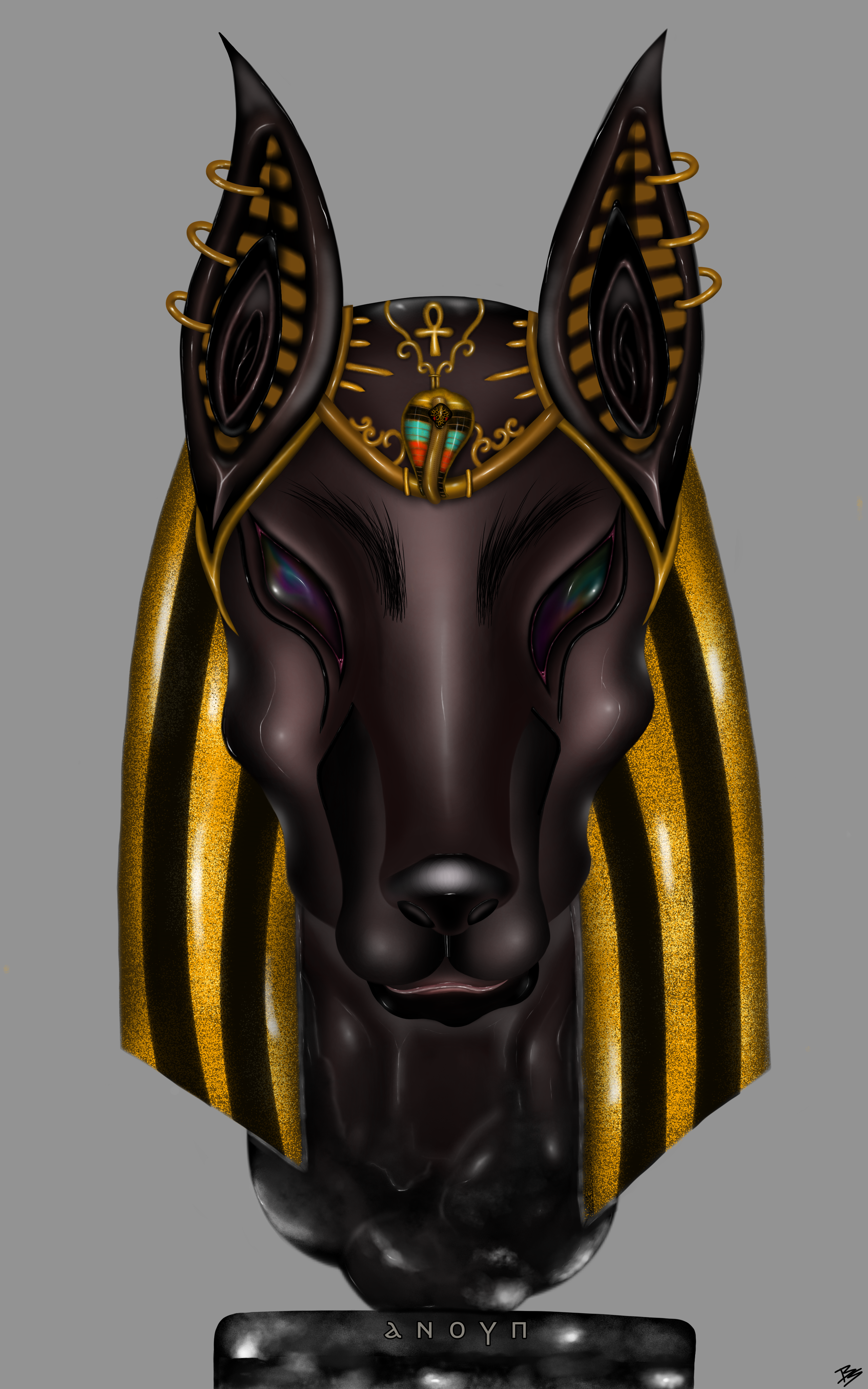 He is the God of the Necropolis Anubis guardian between the world of the living and the world of the dead, the guardian of "Bel Occidental" the land of the dead, he welcomes the souls and mummifies them to make them eternal by purifying their hearts erasing all corruption from the world of the living.