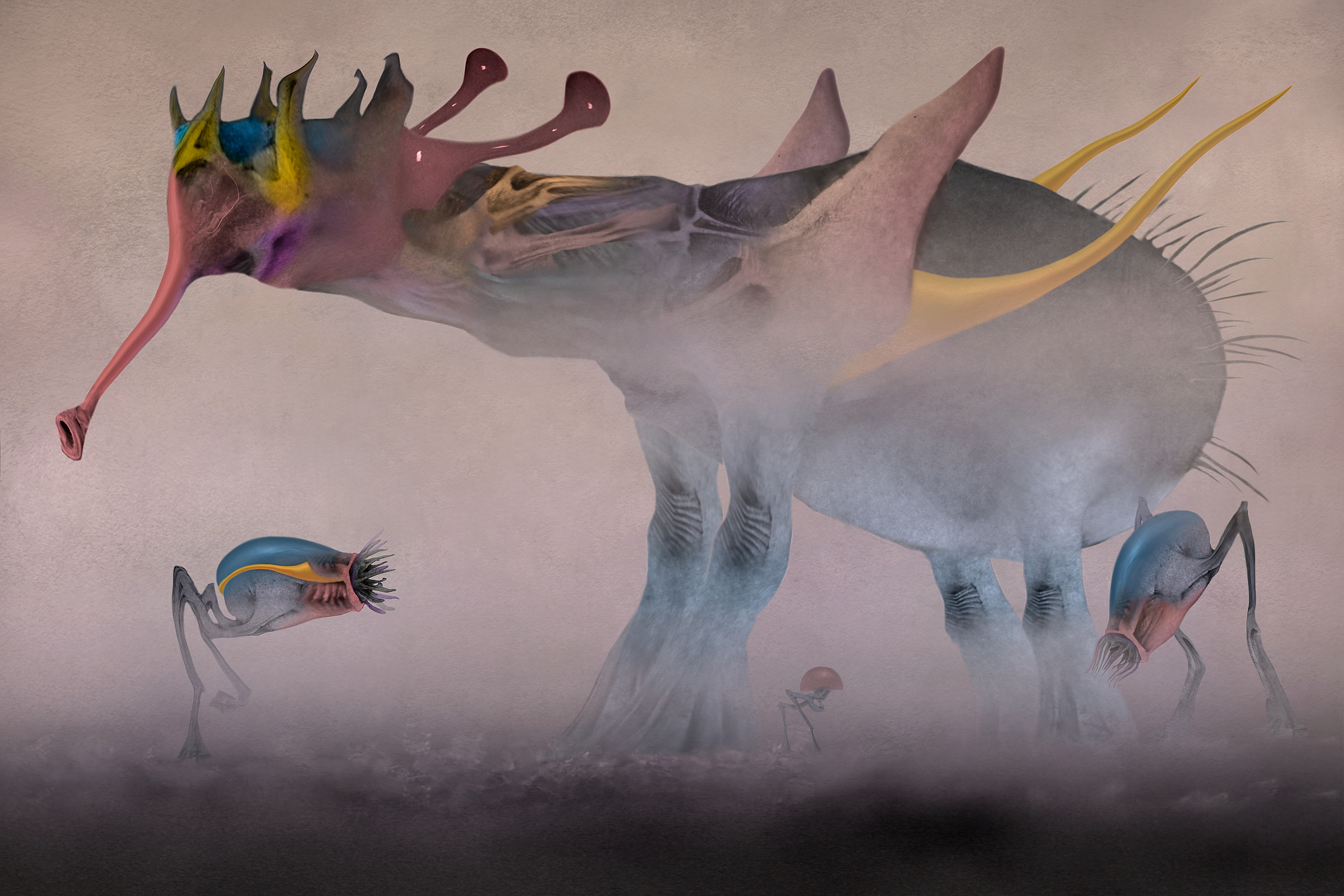 Another scene from the unknown ecosystem ... made by a combination of drawing, painting and macrophotography, all put together and definitively edited in Photoshop. Here you can see three alien species walking together in some misty place.