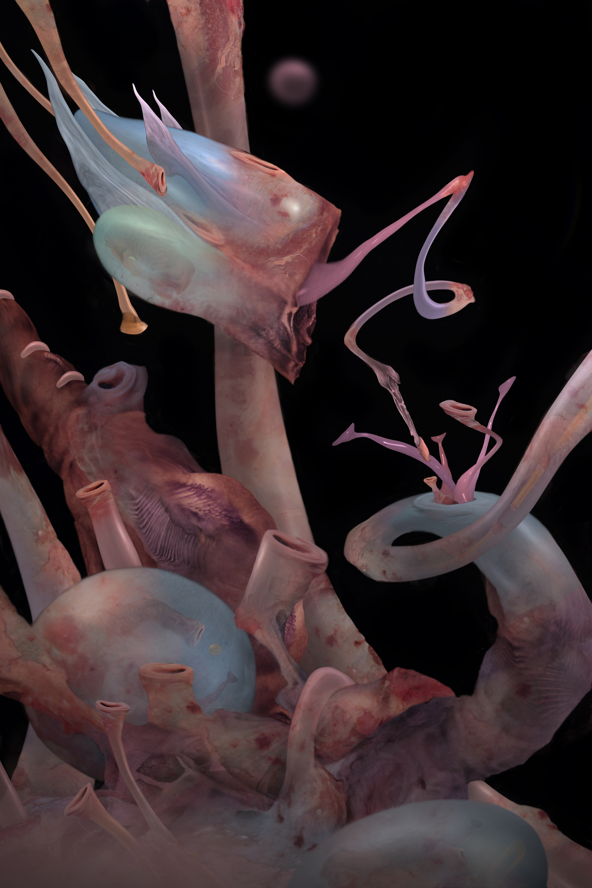 A scene with some alien life forms in intricate connection ... at the bottom of some deep dark ocean. It's a combination of drawing, painting and photography, put together in photoshop ... all the drawing, painting and photography is in all segments my work. The dimension are 3456 px 2304 px