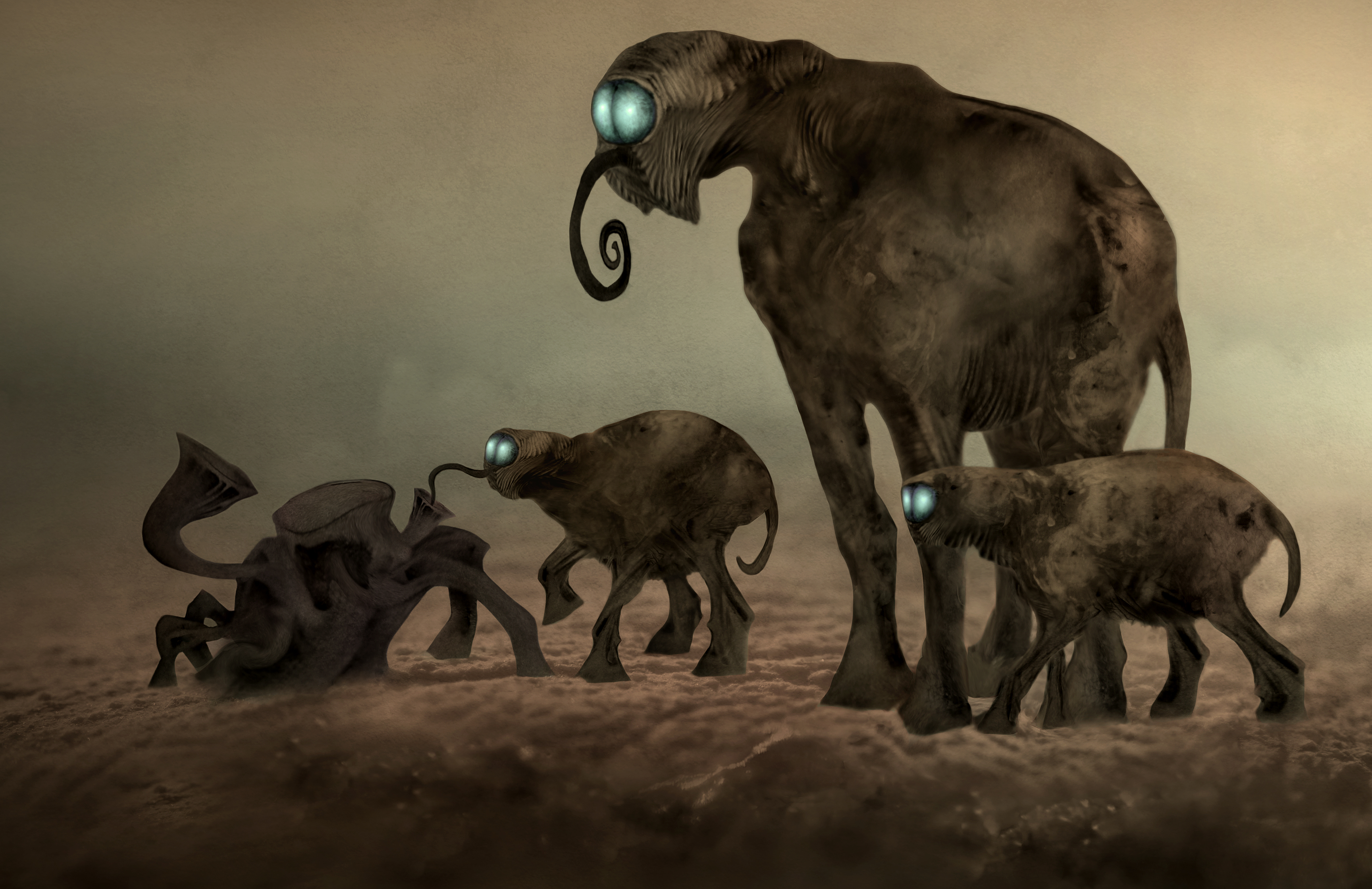 I had fun drawing/inventing some imaginary animals ... a thing that I used to do often in those days, some years ago ... and some of those creatures ended up looking like this, a bit like some mammoths or elephants, a bit like some insects ... moths or butterflies with their long proboscis. The size of the artwork is 3456X2240, and it's a combination of hand drawing, painting and macrophotography, at the end all put together in Photoshop.