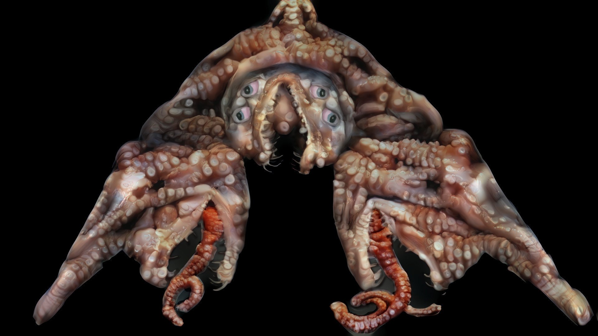 This monstrosity was mutated from a goblin shark. Mixed media my painting from goblin shark reference photo, many generations of back & forth AI DeepStyle runs with my painting as base image and the reference photo as style image, painting on top of that result, more AI runs, etc. Final results includes octopus flesh style runs.