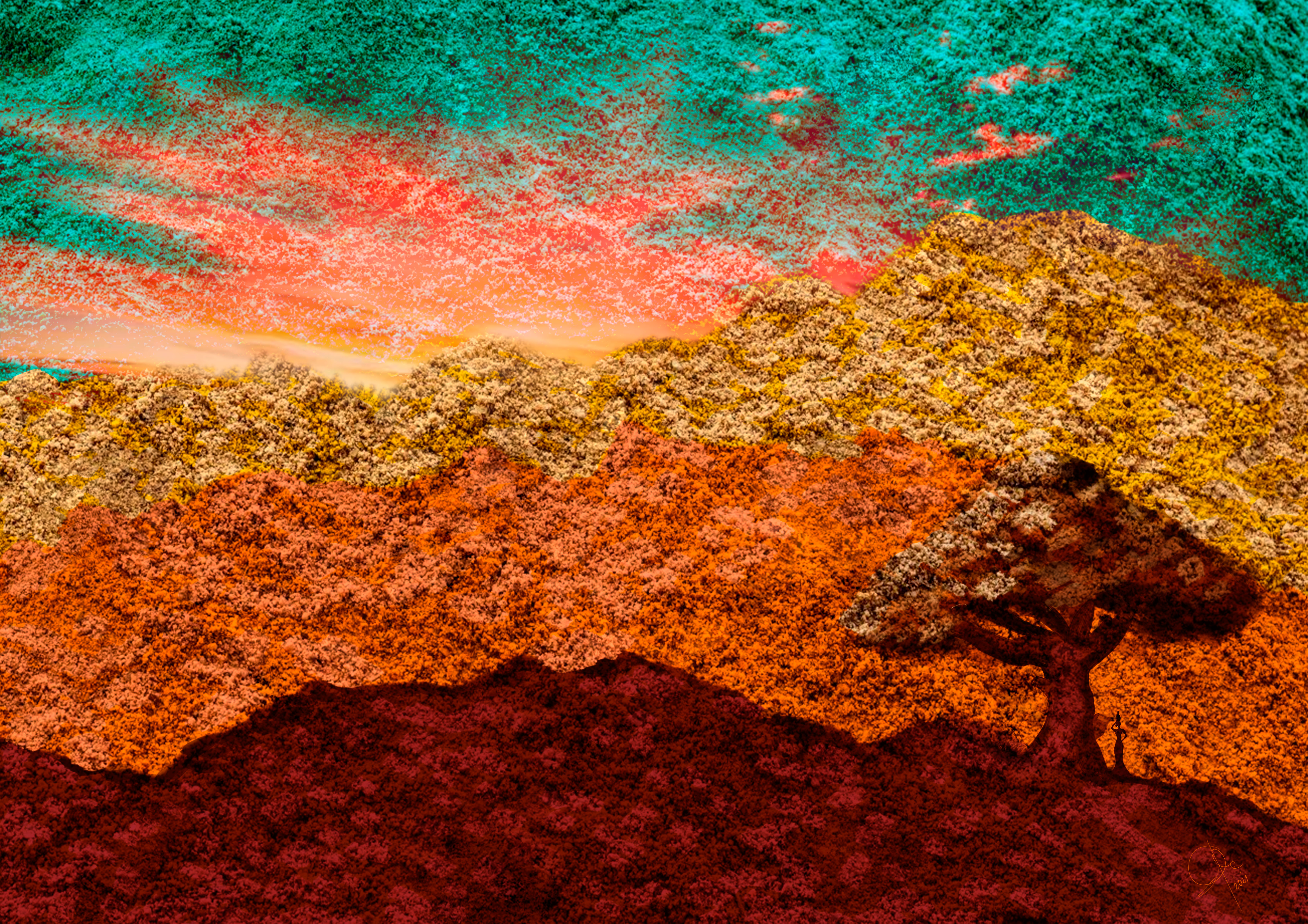 Exuberant woman taking a long way back home. She stops in the shade of an imposing tree to take a break before continuing her arduous walk. But she realizes that there is so much peace in that place, that she couldn't walk another step, but to take root beside that leafy tree.
