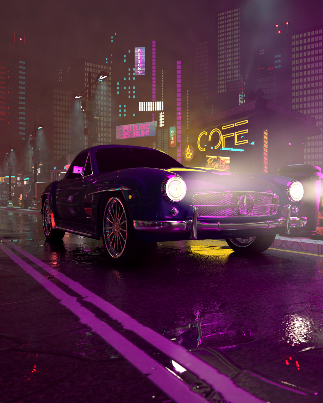 This artwork is set in not-too-distant future in a dystopian city.