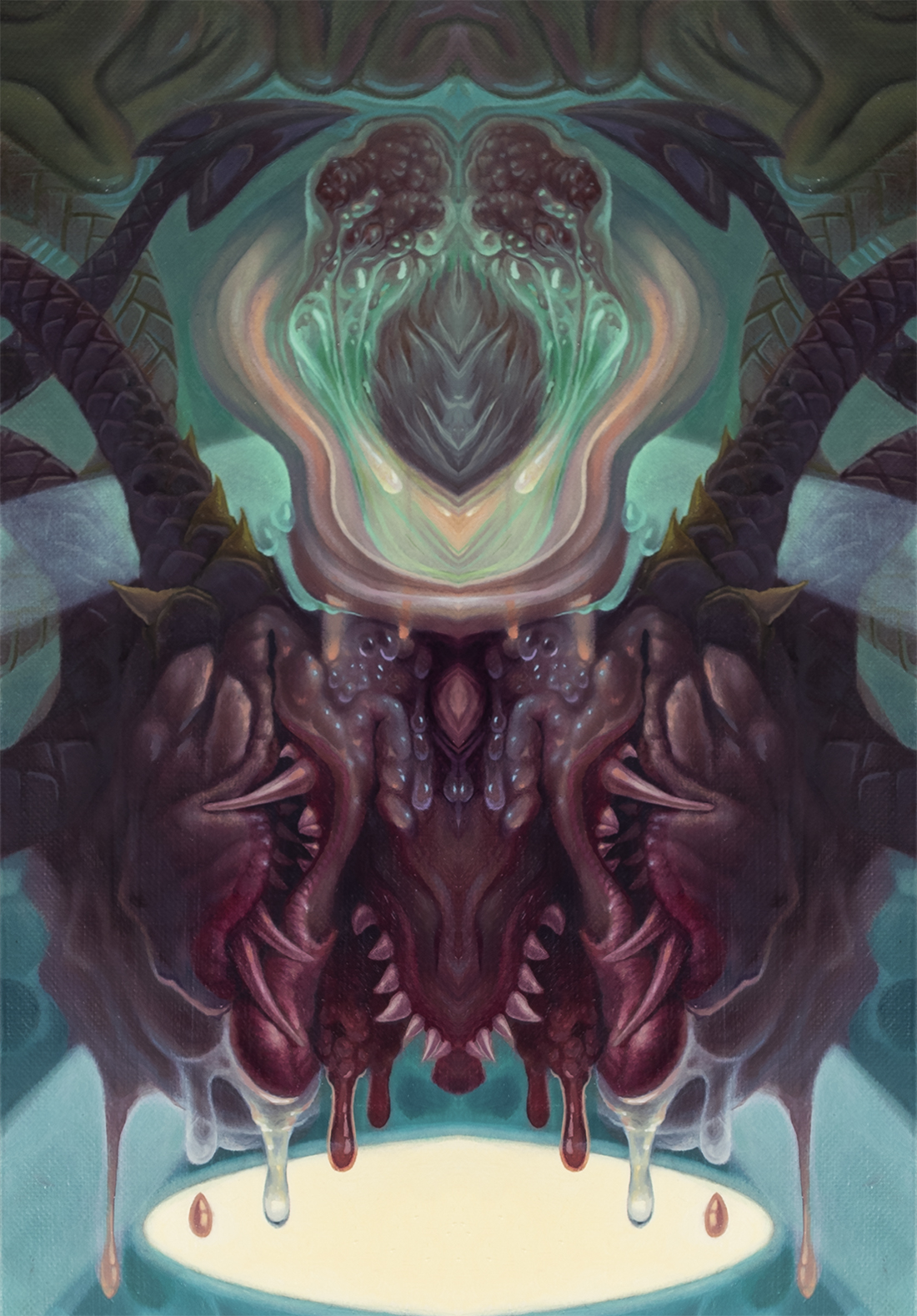 Limited Edition of 6 Baphomets. Unlockable higher resolution image. Description of work: "A simple symmetry extracted from my oil painting ' Alex in Wonderland', pulling out a menacing corporeal pathology of darkness, teeth, recessed lighting, and devil tails. This entity came through in half profile originally in the upper right portion of the oil painting, a particularly ogreish and instinctive creature. I remember contending with its insatiable, cancerous growth by implementing some 80's techno fantasy counter psychology, including, but not limited to a multi hued unicorn horn. It isn't wholly uncommon for the archetypal 'Goblin from the Deep' to make a play in my works, and they make often a particularly challenging force to balance. As the main subject of their own visual domain, they can be quite dramatic."