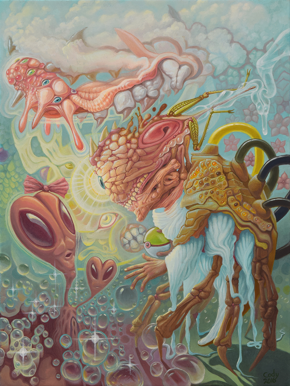 Unique Single Tokenized Edition of my Original Oil Painting on Canvas, 30 cm x 40 cm (approx. 12" x 16"), 2016. Unlockable 3560 x 4739 high resolution image available to purchaser, to really dig into all the details of the work. --Description of the painting's narrative: "In this small work, there are 4 identities; Mr. Crazy Bones on the right, Ms. Alien Head to the left, Atmospheric Chakra Monster up top, and in the mid background is Mr. Crazy Bone’s own ego.