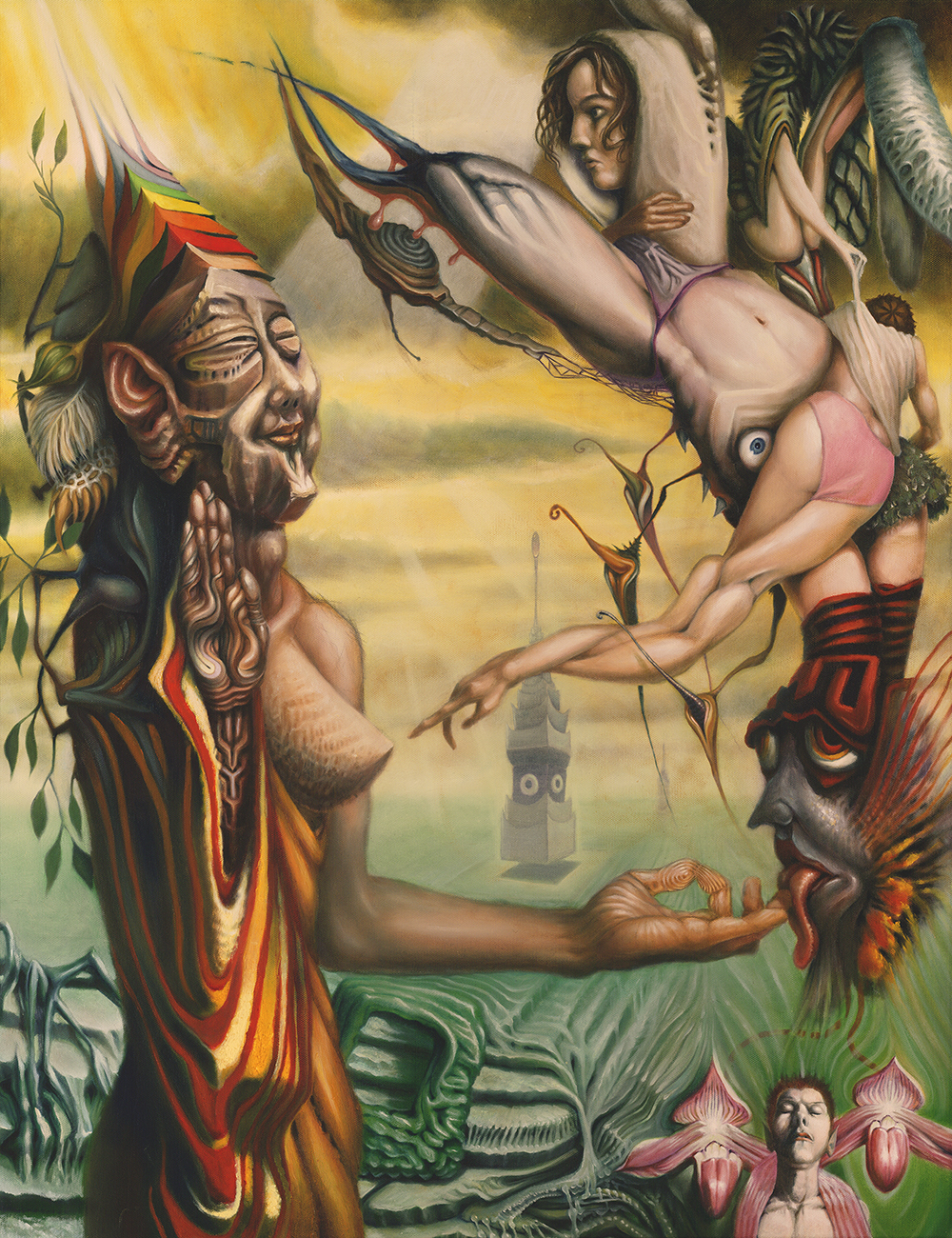 Unique Single Edition NFT of my Original Oil Painting on Canvas, 28" x 36", 2007. Nice super high resolution 4200 x 5459 image on purchase. Image Size: 28.9 MB. This work has lots of fine up close features for exploring. Description of the work: "I created this piece during my first time living in Thailand and traveling through the region, including Cambodia’s Siem Reap, where Angkor Wat is set. While in SE Asia , I learned a great deal about Theravada cosmology, and used the exposure to iconography and local cultural vibe as inspiration for this work. The piece is built upon the basic format of the Buddha’s trial with Mara (a Deva) as Mara tempts the Buddha from attaining perfection (Nirvana/Nibbana). But the inspiration for the piece is multi-layered. In Thailand there is a third gender, the Katooey or Ladyboy, which is a normative accepted identity. In my own experiences, also I have come across many instances of gender ambiguity–when I was eleven I spontaneously fell into a gender void in my awareness, unable to find anything that defined me as male or female. Later, as a teen and young adult I began to realize the spirits of various gender types within me. Even the realization of the attributes of my parents merged within me added to this comprehension. The idea of transgender, as a term, became the transcendence of gender; namely the channeling of many variations of gender, and in due process inhabiting all of them, and yet none with particular ego attachment. It is a very Buddhist kind of meditation, to be aware of the discernment of many genders within one’s being, exploring them, and yet graduating past them as definitive markers of personal identity. One then becomes oriented naturally within the genders as a manner of being and not a manner of categorical reflection."