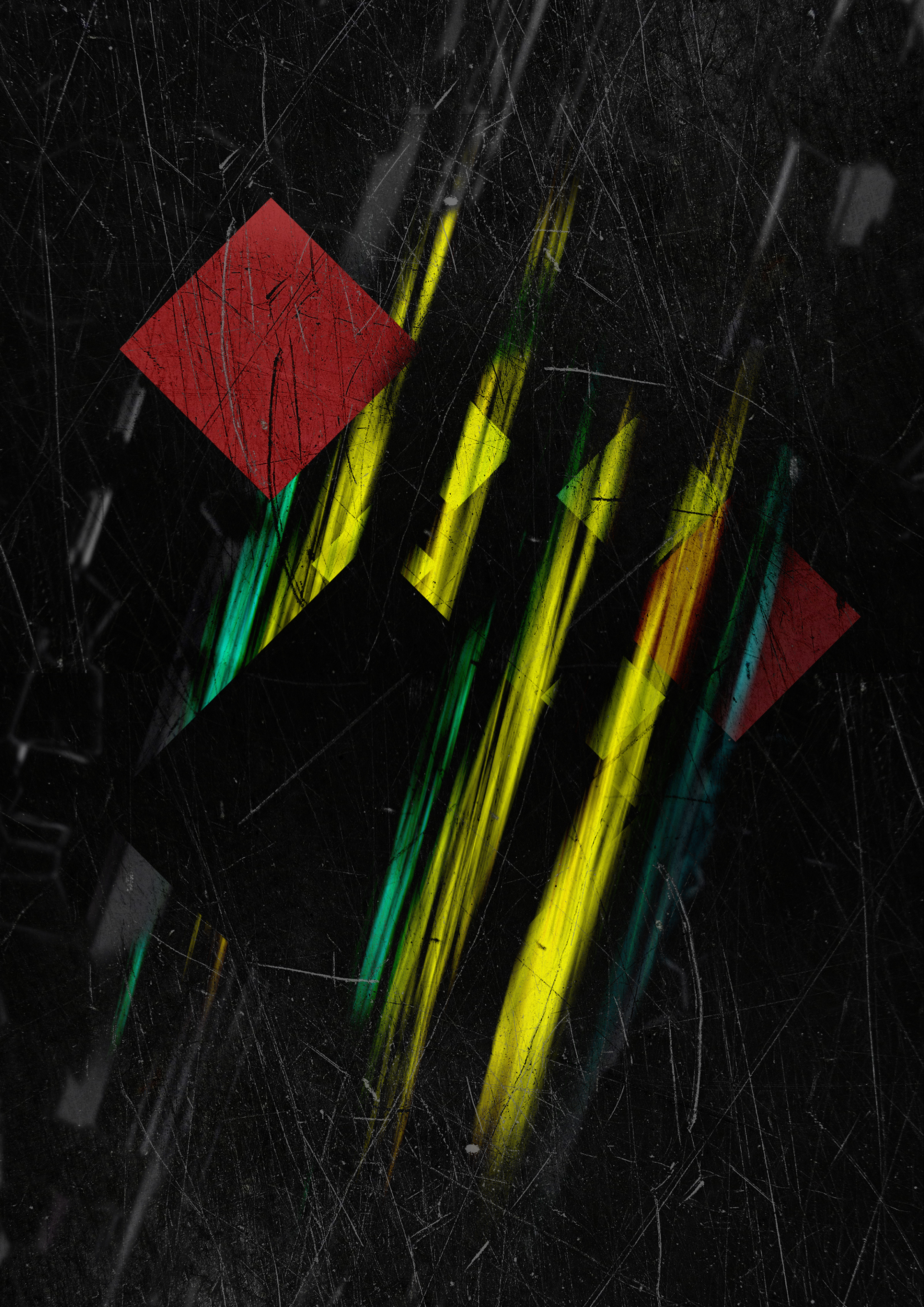 Abstract hand-drawn representation of light rays. The art consists of abstract small elements, lines and textures. In the middle, there are 4 light rays breaking through the darkness.