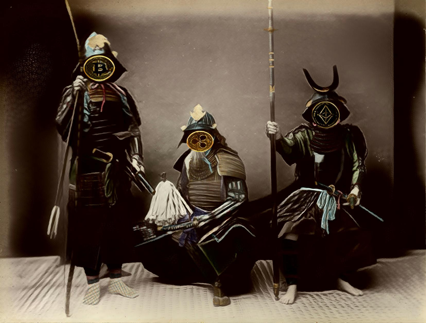 The Three Crypto Samurais: Bitcoin, Ripple and Ethereum. Dark version. JPG 1655 x 1253. One only edition.