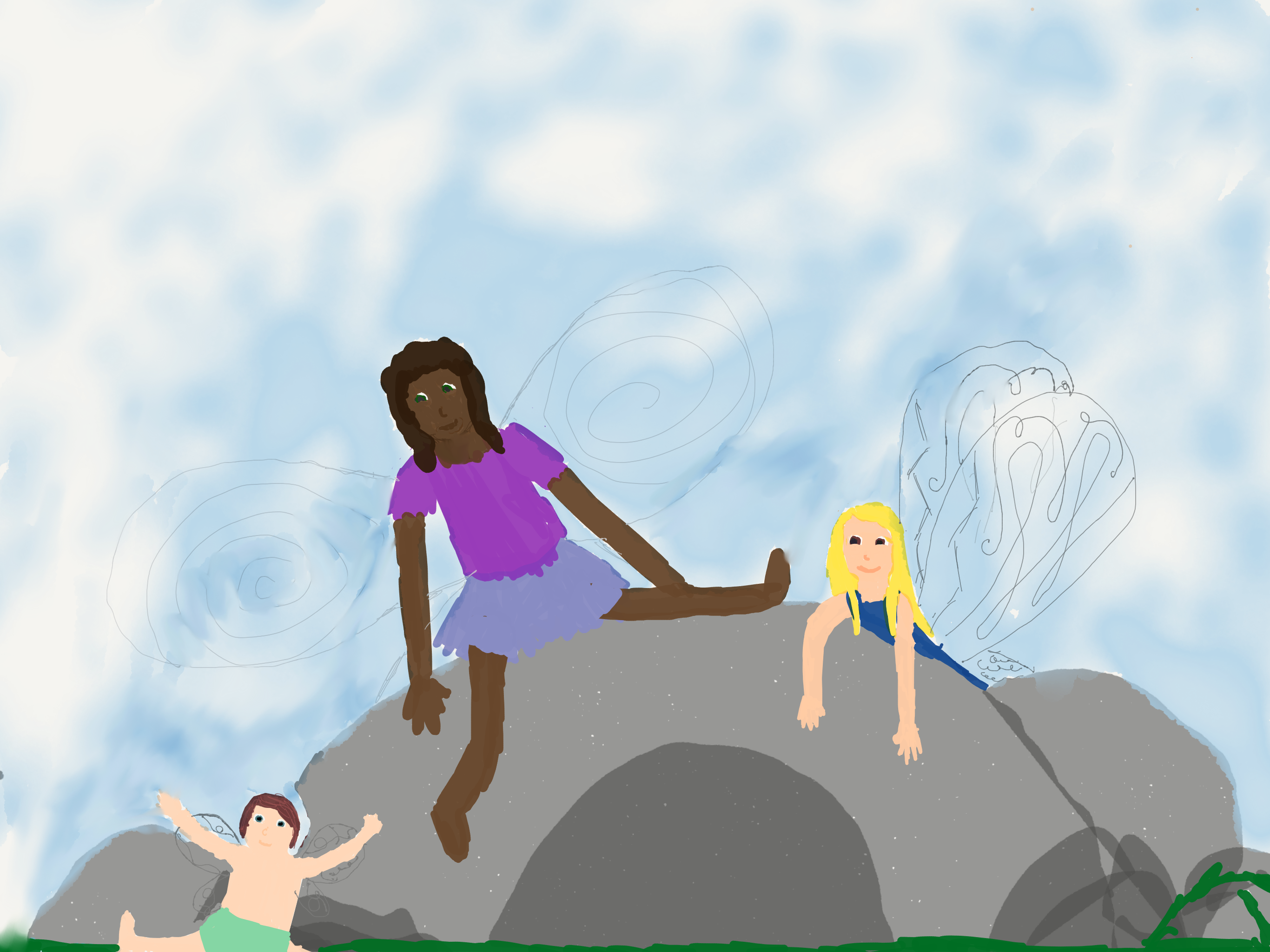 In the far distant fairy garden three fairies play outdoors on the biggest rock they could find.