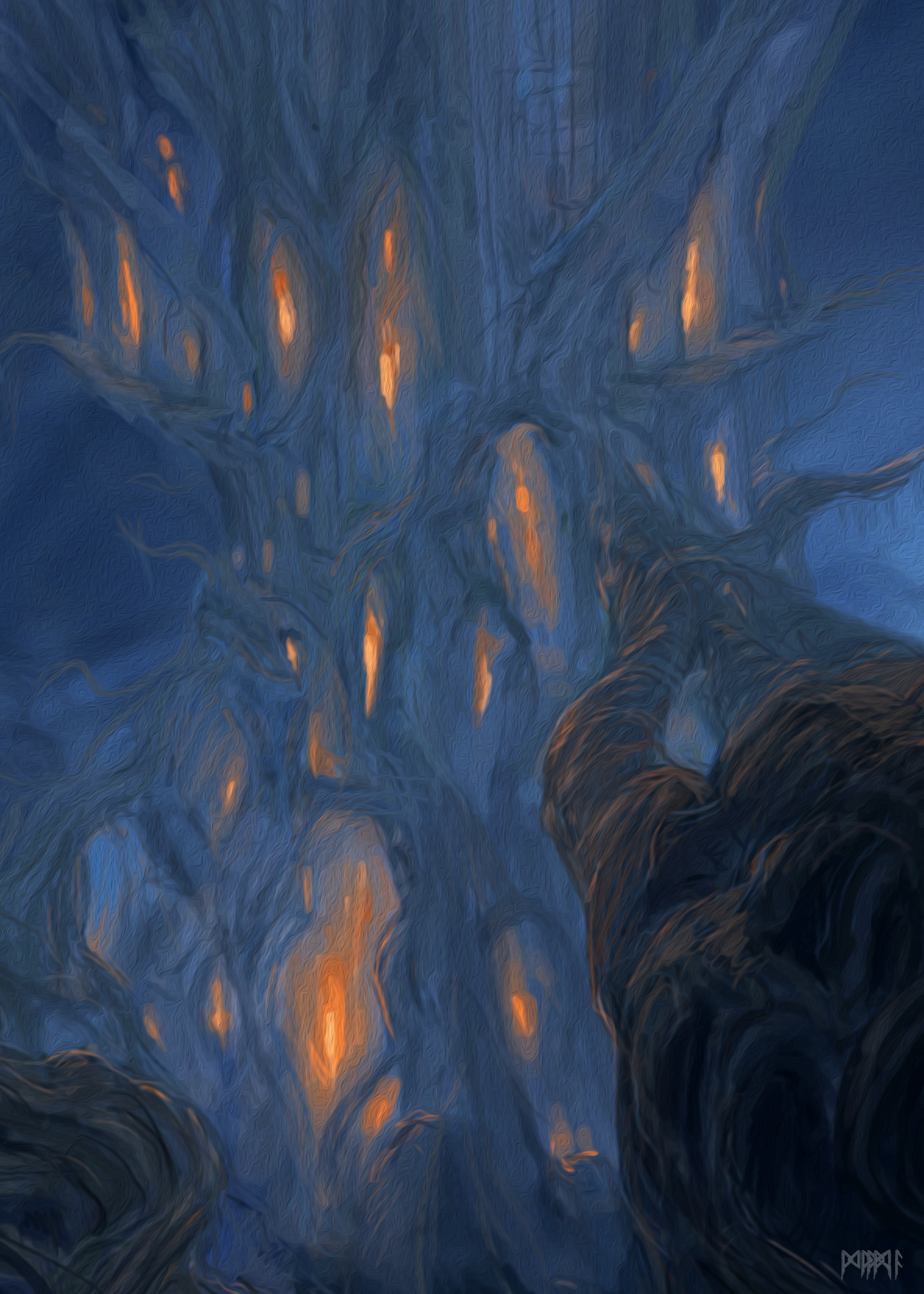 Cool looking Fantasy landscape art named Forest of Dark Magic by Mark Balazic. This magical dark woodland features dark trees in a blue light mystical environment. Adobe Photoshop Digital drawing with Wacom Intuos Tablet. PNG file 3360x4260
