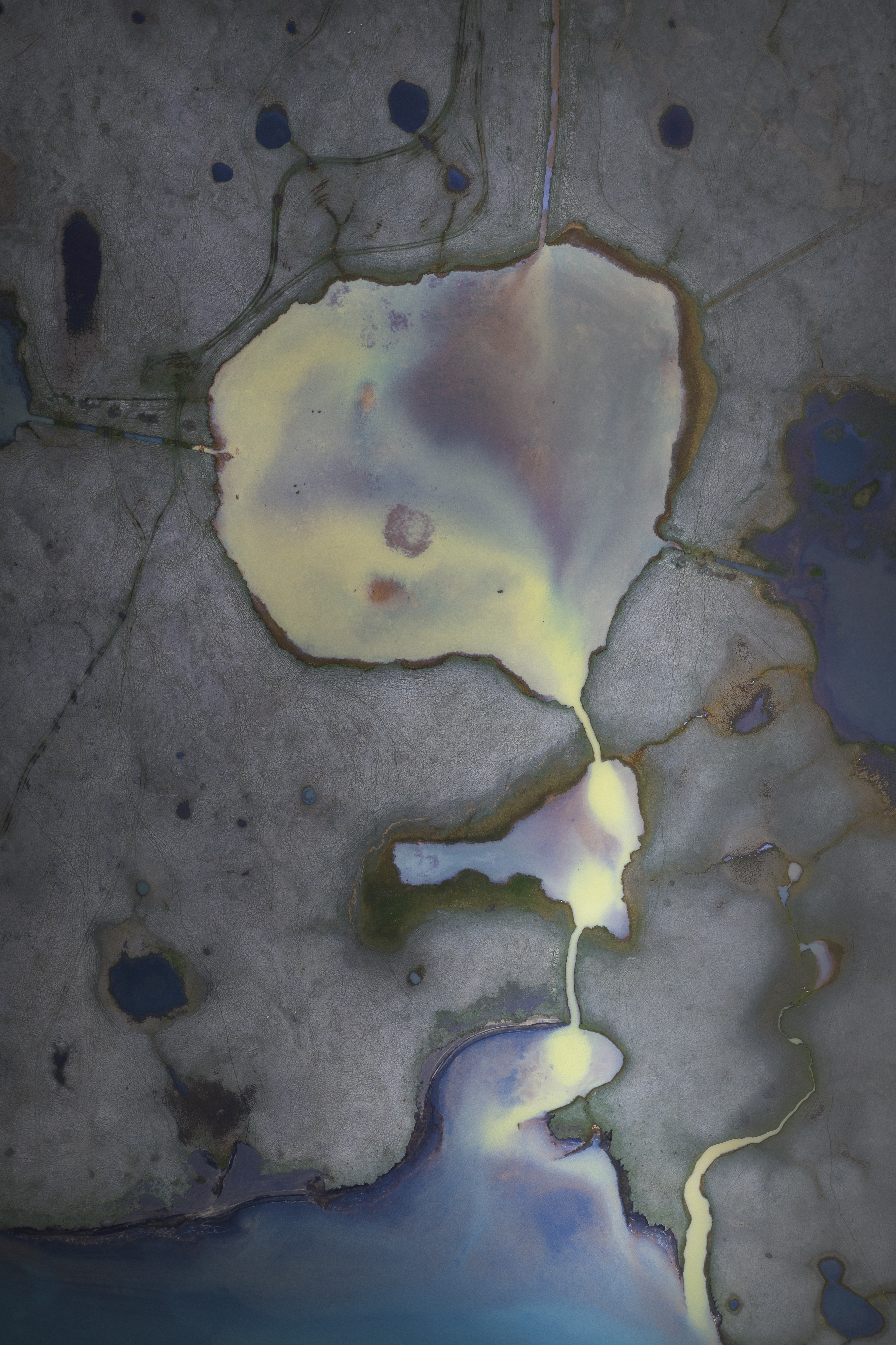 These waters flow down river paths, creating ponds and lakes with wide variety of color palettes. This piece is a representation of what happens to nature when humans interact. Sadness and beauty bundled up in one scene.