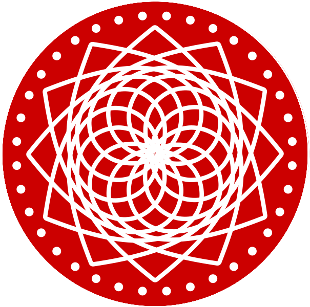 The logo represents the sacred geometry of connections/collaborations/cooperations driven by the heart (12 hearths around) and the "thought-word-action" (36 dots). The red color represents the current state: Muladhara