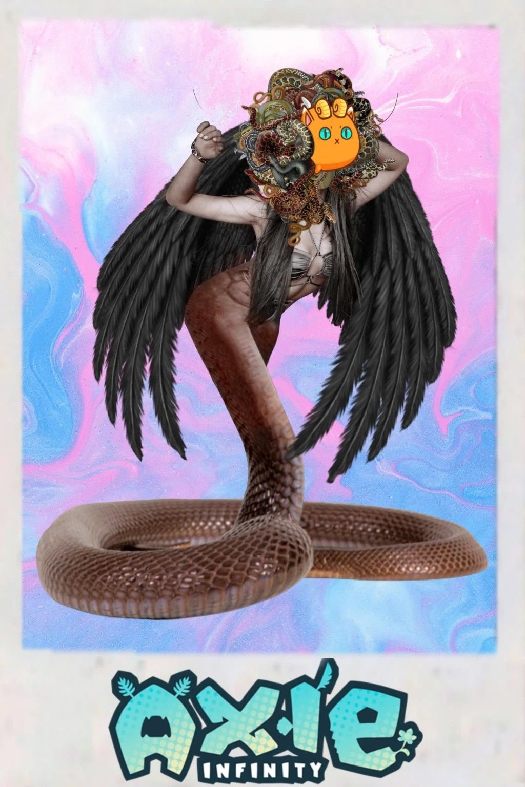This card I call AXIE MEDUSA, transform into a snake body, to give it power, strength, venomous and able to fly to grab their prey. Winning any battle unimaginable, which makes it sexy, but dangerous. / JPG 1024x1536