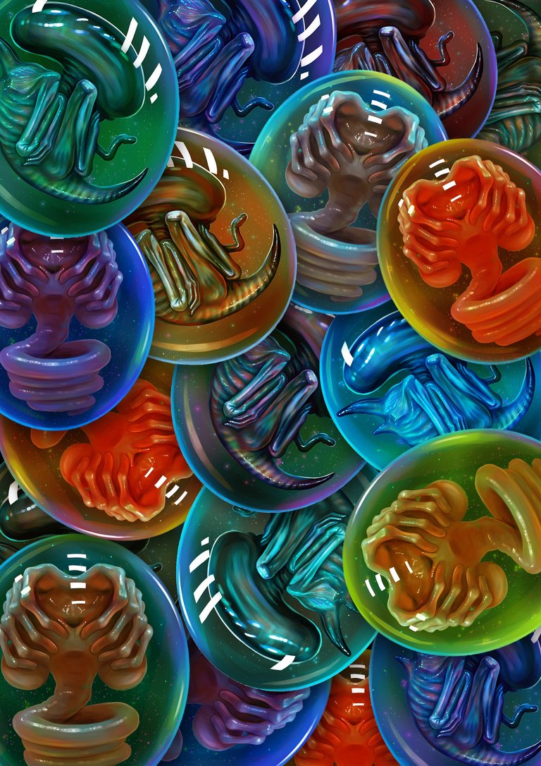 I could not resist made a postcard) They wrote to me that these embryos look like candies) monpensier) With surprises) I made such a postcard out of 8 arts. There are many xenomorphs here. More more to the xen world) Paint tool sai program