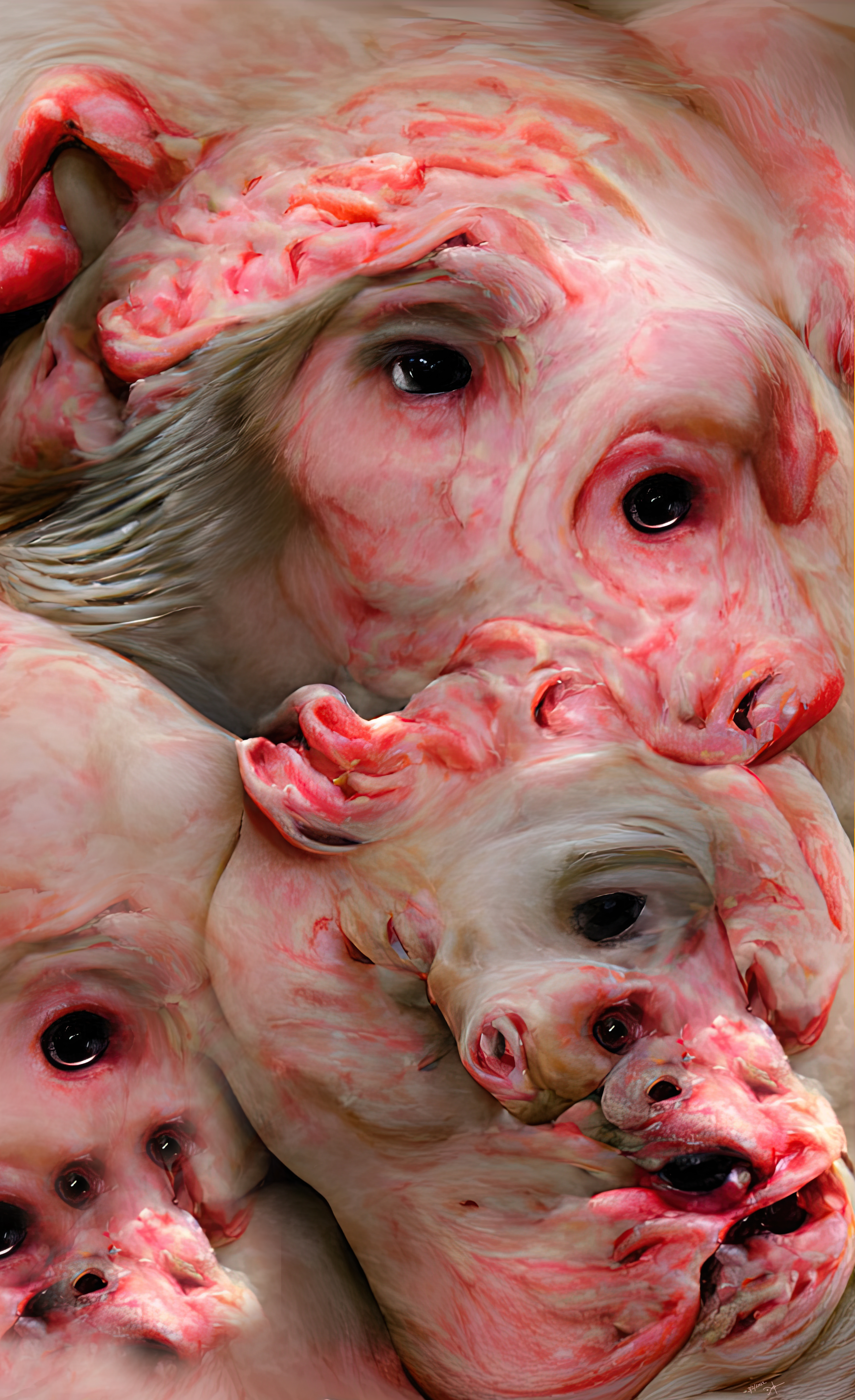 genetic lottery III, gmo nightmare, half human half pig, transhumanism V1.0, so much pain and error. mixed technique: text and gene based AI and Dpaint and compositing. 3800x6300 PNG painted date/signum