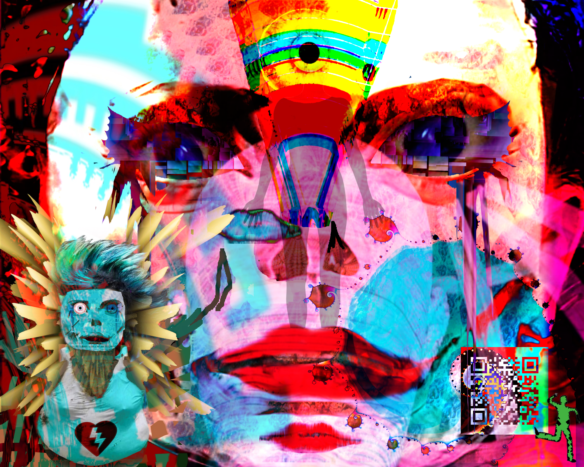 Look into my Eyes, a collaborative canvas project of our "online art" show format. collaborators: Julia K Ponsford, Vache Morte, Aemile-KH, Crimsonclad, R0nd0n and El Geko. Starting picture was an AI Portrait provided by El Geko. Paint & Collage 2000x1600
