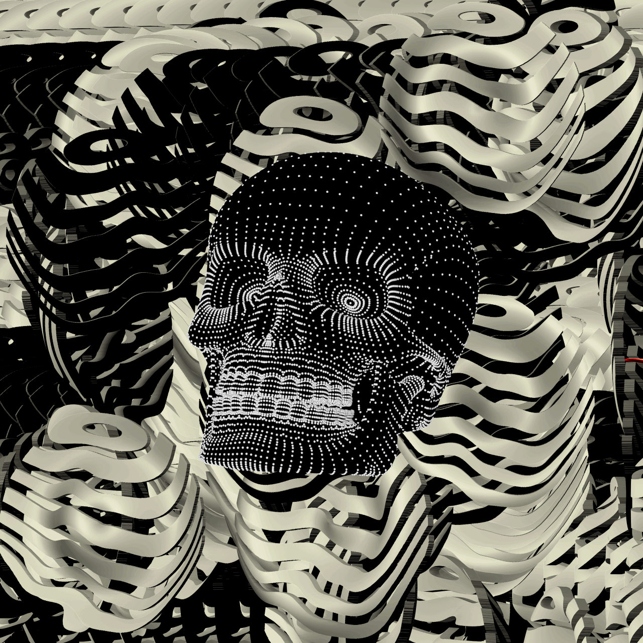 3D skull with white dots attacked by bloody red hummingbirds. A spontaneous online art Gif animation, created live during my online art show at NFT showroom discord.