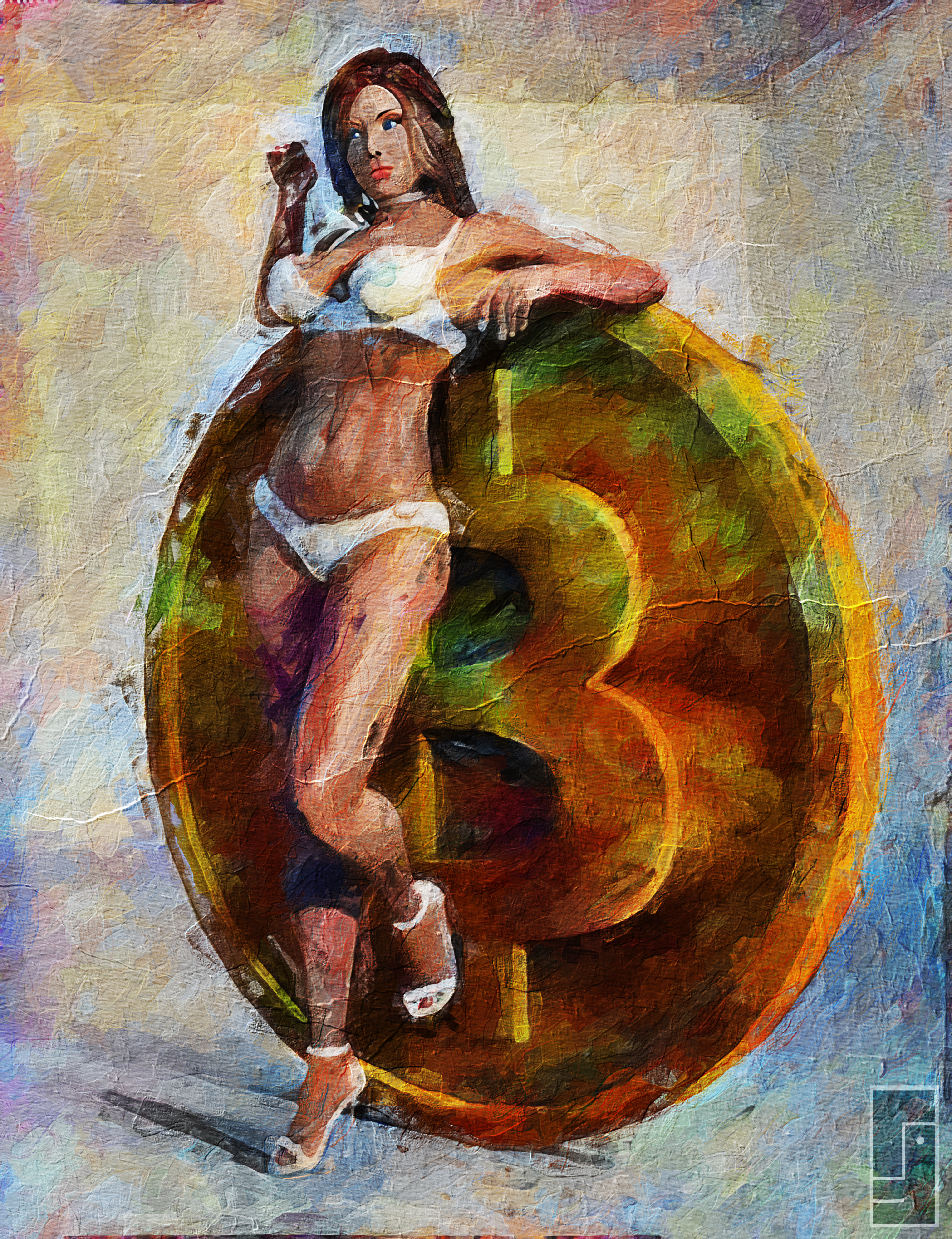 Sexy pose of a model and behind a big coin with the bitcoin logo.