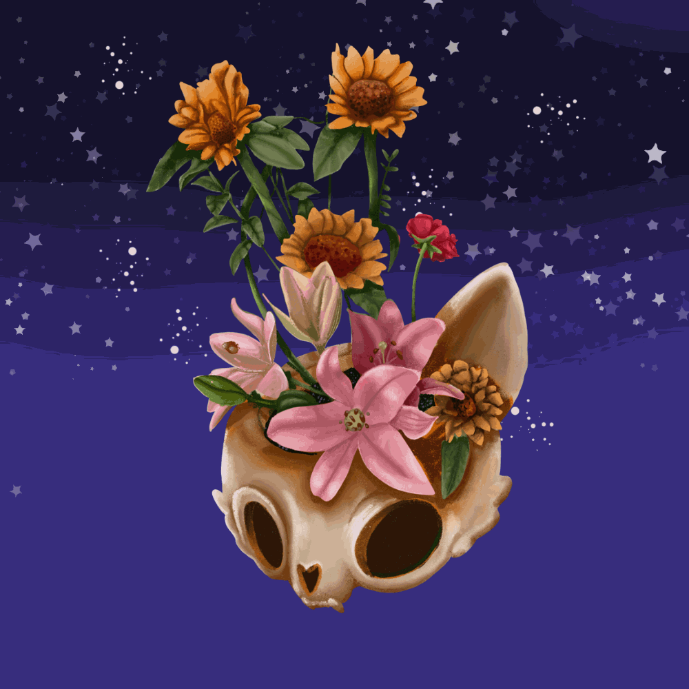 A cute space sunflower and cat skull GIF animation. If you want to view the process and read the cute story behind it I invite you to check this Hive post: https://peakd.com/hive-156509/@grisvisa/space-sunflower-and-cat-skull