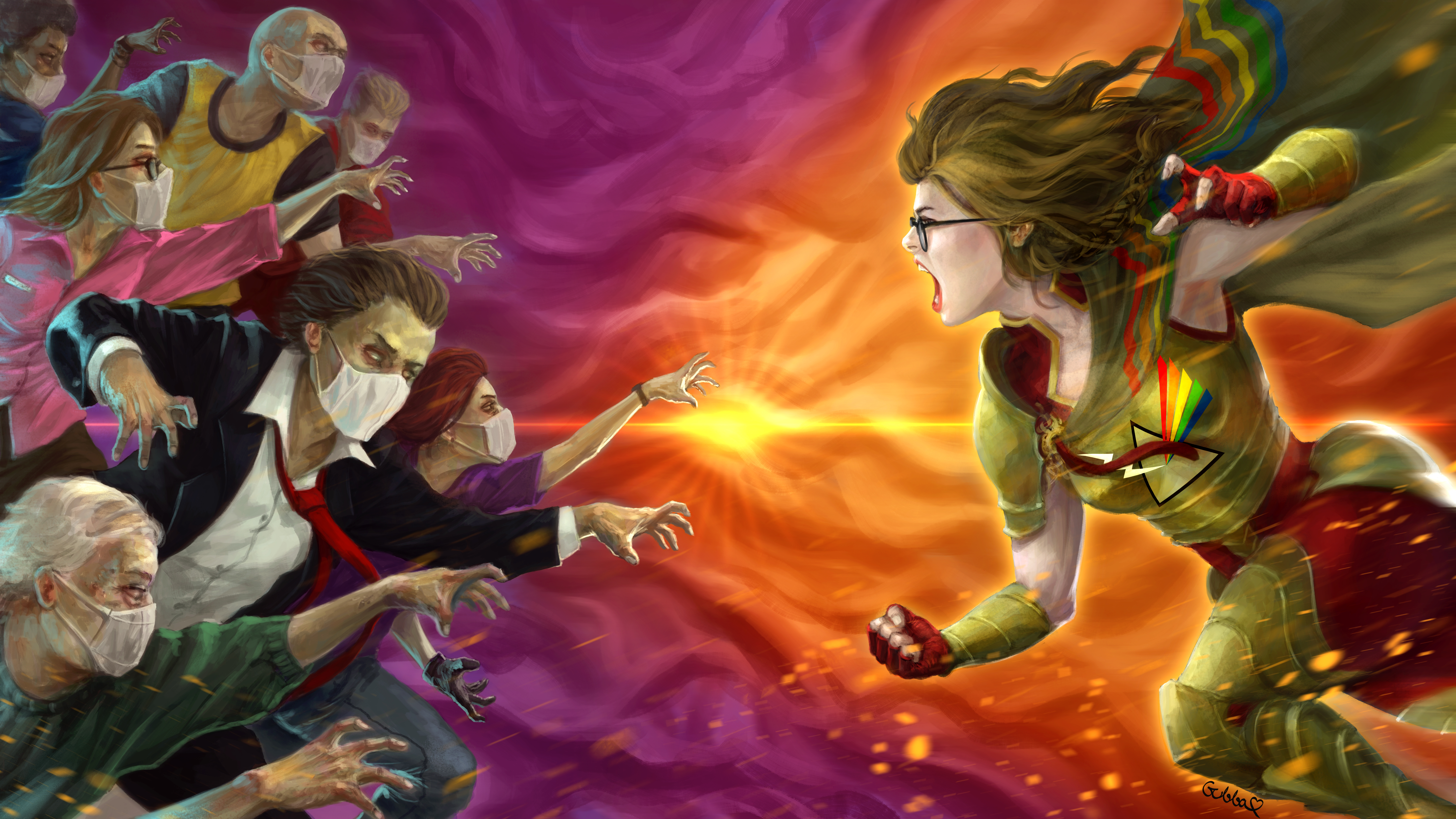 Frankie Ravens gets ready to deliver a karate chop to zombies. Zombies is an original artwork by GubbaTV, and part of the Frankie Ravens Comic Book Collection Signed NFT .JPG 7087x3987px