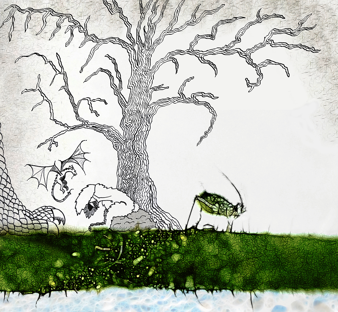 Rachel Rabbit, the dragons and a forest creature. Collage. Ink on paper, photomanipulation, added digital drawings. Small file: 1,09 MB, 1085 x 1000 px, RES 100. Unlockable large file: 16,9 MB, 5492 x 5061 px, RES 300.