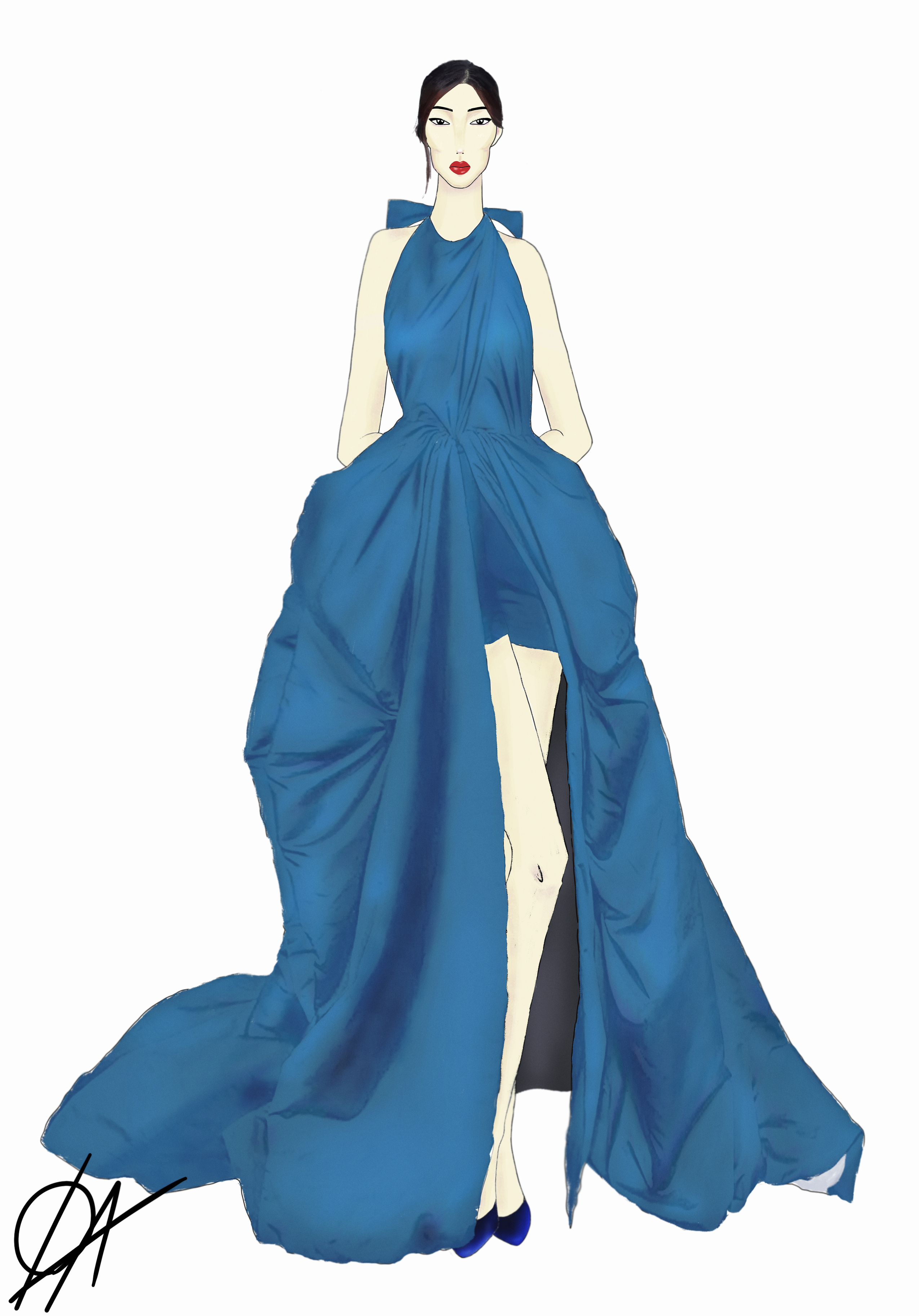 An elegant petrol blue outfit by Valentino featuring a dress with pockets and tight-high shorts. Actress Gemma Chan wore this design at the 76th Annual Golden Globe Awards in Beverly Hills, California, 2019. This illustration is created in a fashion presentation style. The model in it has industry classic body proportions, drawn on top of our 8,5 x 11 inch Croquis – 10 heads size. The resulting figure is slightly elongated, resembling the ideal woman figure as perceived by the fashion industry / JPG 2550 x 3652