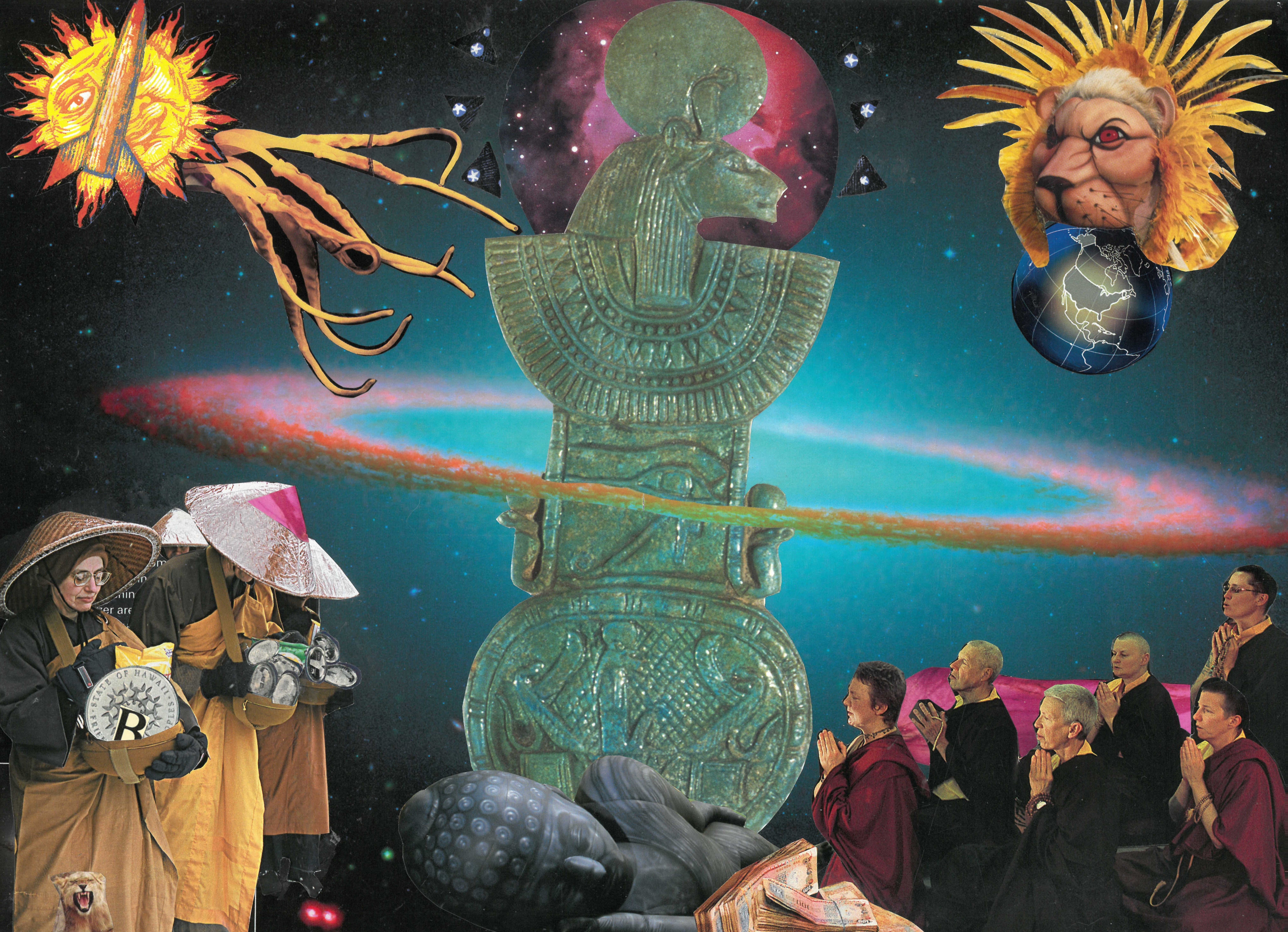 Hand made paper collage from found pictures with glue and scissors. Then scanned to upload for minting as NFT. Leo the token is rising in price like a new god on the blockchain. All the world will know the glories of Leo.
