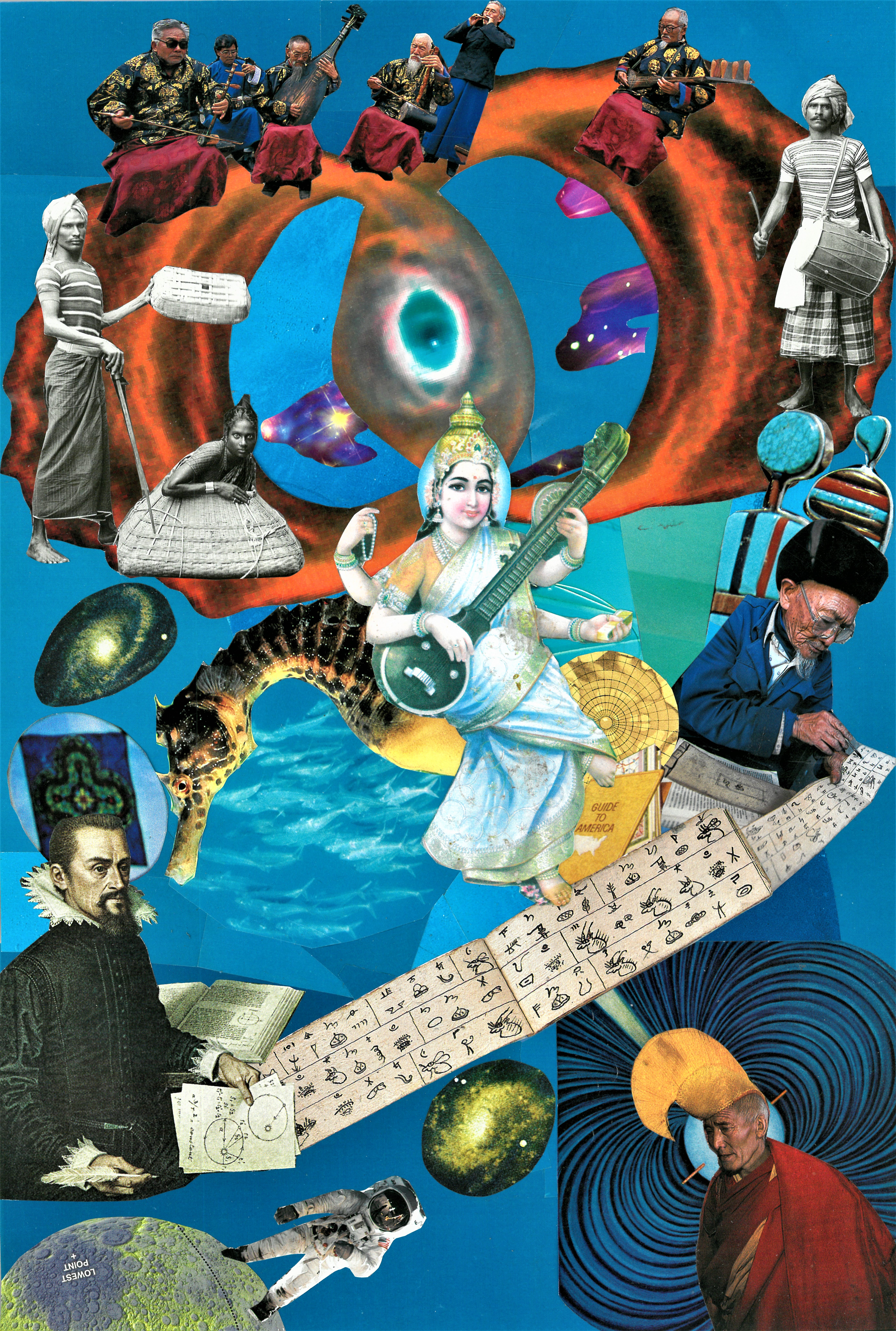 Handmade paper collage, using found pictures, scissors and glue. Then scanned to mint as NFT. Saraswati is the Vedic goddess of learning. Playing her sitar, she manifests the wisdom and letters of the scribe and artist. This artwork is a sister to an earlier collage called "Kali and Cosmos" available here in my collection.