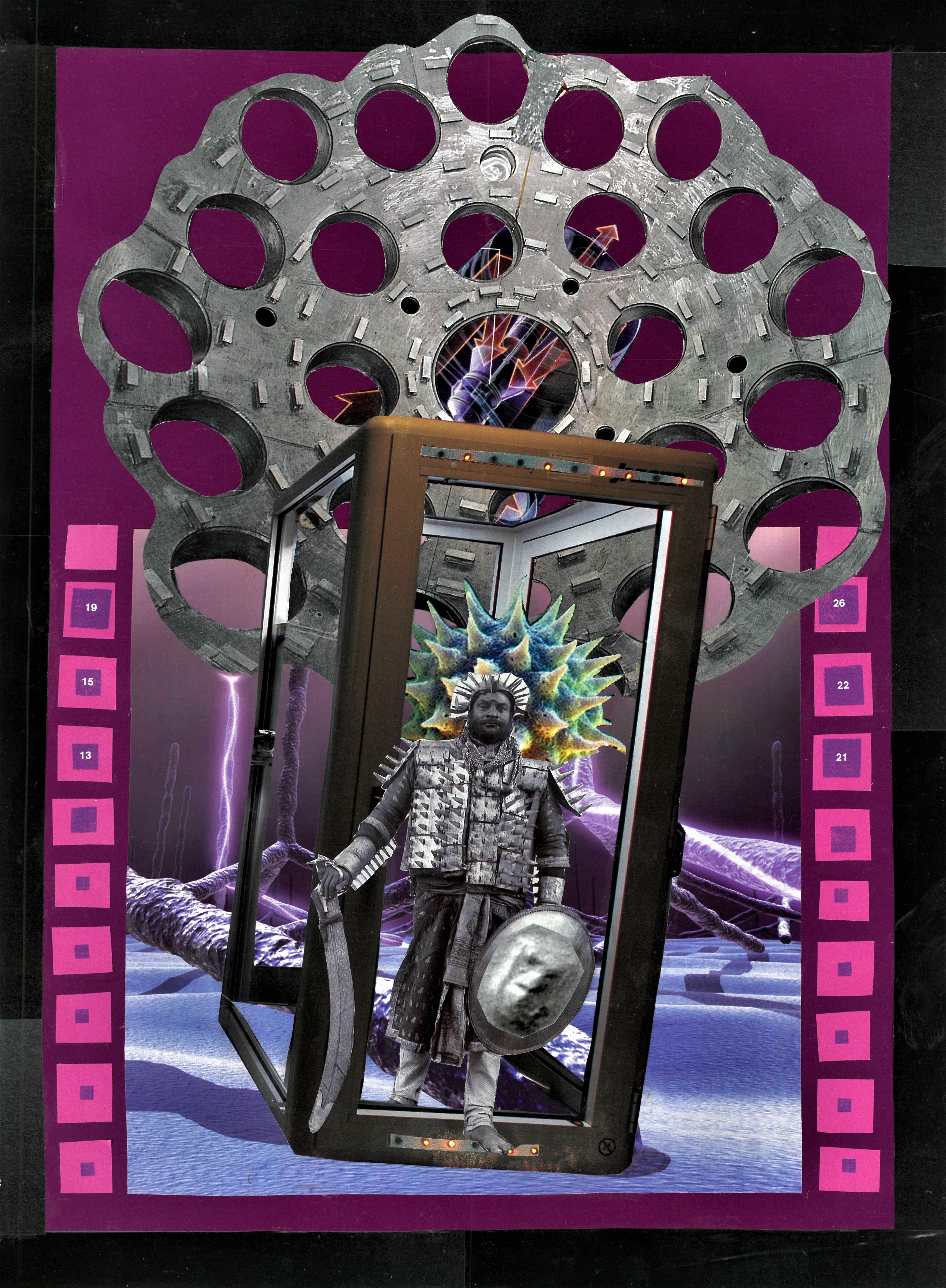 Handmade paper collage using found pictures, scissors and glue. Then scanned to upload as NFT. Mars the god of war descends from his space ship onto the new planet surface. His teleporter arrives and he is stepping out.