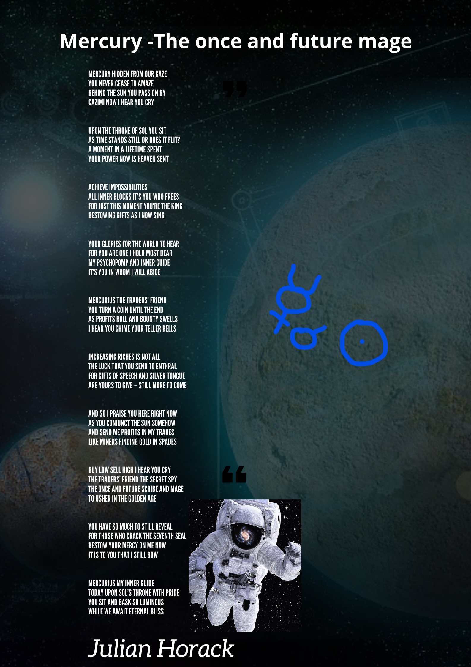 I wrote this poem at the moment of planet Mercury's transit across the sun, known as Mercury conjunct Sun by astrologers. The precise point of exact conjunction is known as "cazimi" by Medieval astrologers and alchemists, meaning "in the heart of the sun" or "on the throne of the sun". This window of opportunity only lasts a few hours, although occurring 6 times a year. It's a time of great potential magic and miracles, genius and brilliance. Any child born during these hours will be a genius. I wrote this poem during this time in honor of the god Mercury, guide of the departing souls, muse to the alchemists and winged messenger, god of traders and scribe of the gods.