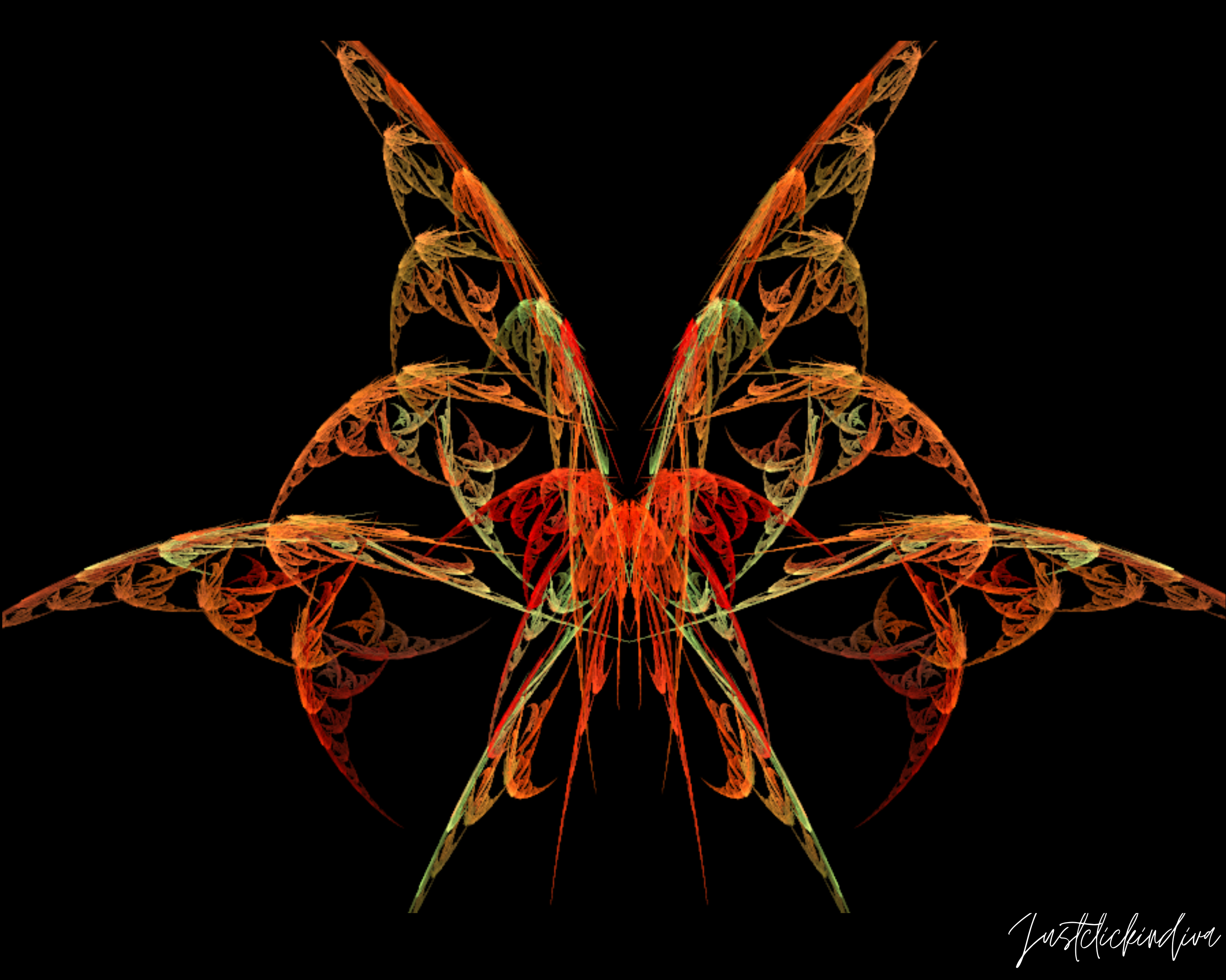 This drawing is a digital art fractal produced with the fractal rendering program, Apophysis 2.09. Alien Butterfly No. 2 represents an alien version of the classic butterfly. The two sets of eyes and moss surrounding its mouth suggests a creature from another world.